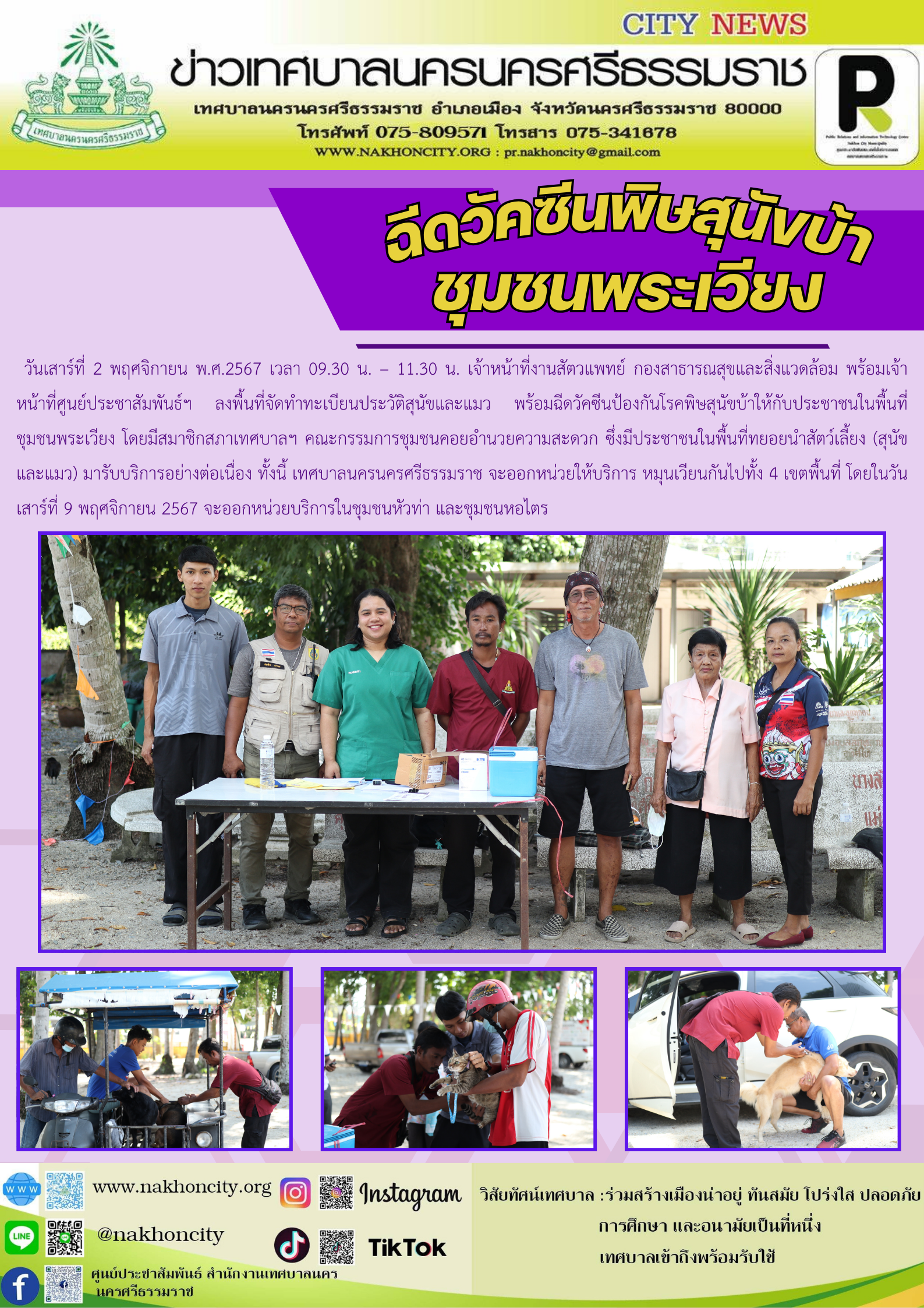 วันเสาร์ที่ 2 พฤศจิกายน พ.ศ.2567 เวลา 09.30 น. – 11.30 น. เจ้าหน้าที่งานสัตวแพทย์ กองสาธารณสุขและสิ่งแวดล้อม พร้อมเจ้าหน้าที่ศูนย์ประชาสัมพันธ์ฯ ลงพื้นที่จัดทำทะเบียนประวัติสุนัขและแมว พร้อมฉีดวัคซีนป้องกันโรคพิษสุนัขบ้าให้กับประชาชนในพื้นที่ชุมชนพระเวียง โดยมีสมาชิกสภาเทศบาลฯ คณะกรรมการชุมชนคอยอำนวยความสะดวก ซึ่งมีประชาชนในพื้นที่ทยอยนำสัตว์เลี้ยง (สุนัขและแมว) มารับบริการอย่างต่อเนื่อง ทั้งนี้ เทศบาลนครนครศรีธรรมราช จะออกหน่วยให้บริการ หมุนเวียนกันไปทั้ง 4 เขตพื้นที่ โดยในวันเสาร์ที่ 9 พฤศจิกายน 2567 จะออกหน่วยบริการในชุมชนหัวท่า และชุมชนหอไตร |