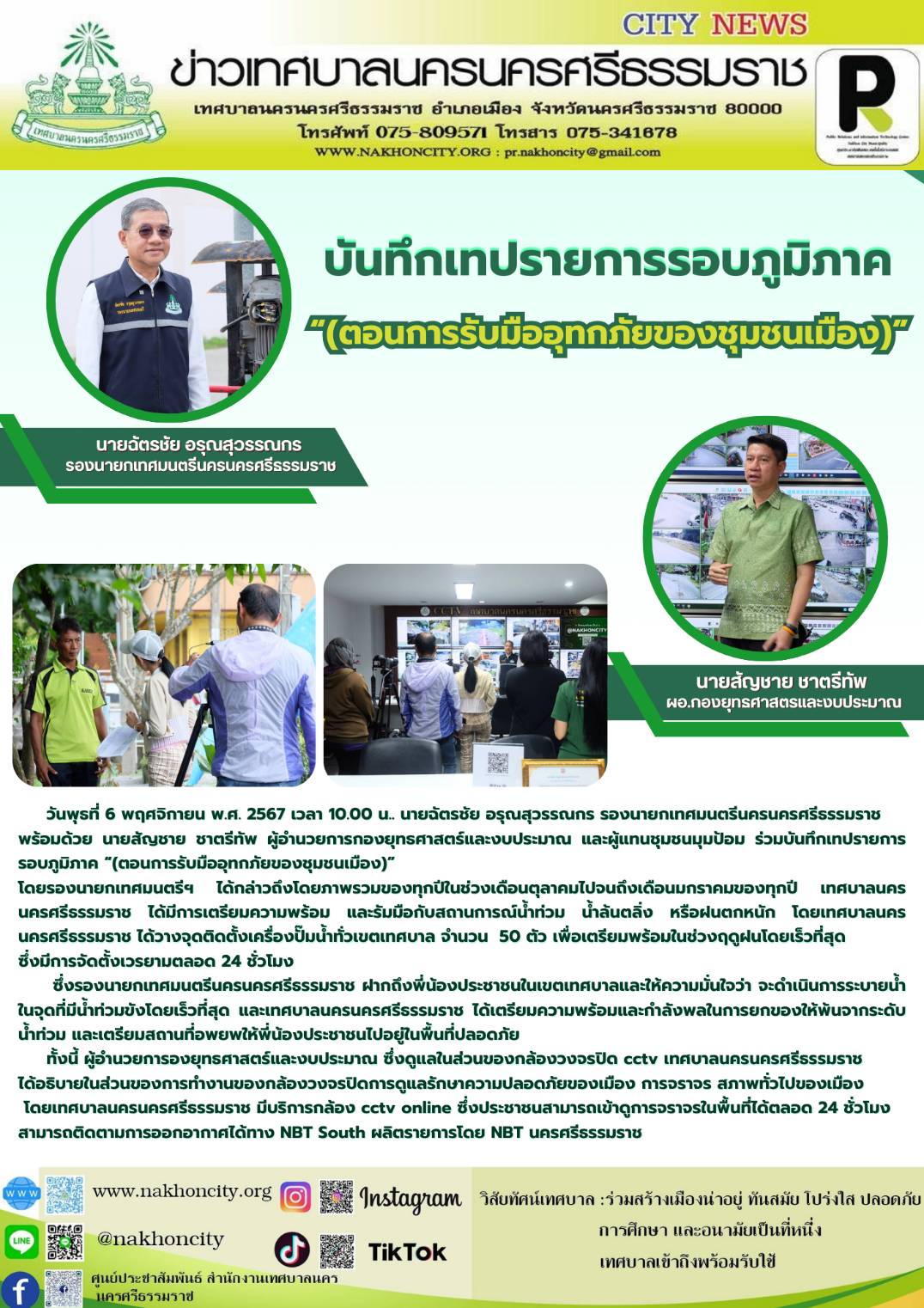 วันพุธที่ 6 พฤศจิกายน พ.ศ. 2567 เวลา 10.00 น.. นายฉัตรชัย อรุณสุวรรณกร รองนายกเทศมนตรีนครนครศรีธรรมราช พร้อมด้วย นายสัญชาย ชาตรีทัพ ผู้อำนวยการกองยุทธศาสตร์และงบประมาณ และผู้แทนชุมชนมุมป้อม ร่วมบันทึกเทปรายการรอบภูมิภาค “(ตอนการรับมืออุทกภัยของชุมชนเมือง)” โดยรองนายกเทศมนตรีฯ ได้กล่าวถึงโดยภาพรวมของทุกปีในช่วงเดือนตุลาคมไปจนถึงเดือนมกราคมของทุกปี เทศบาลนครนครศรีธรรมราช ได้มีการเตรียมความพร้อม และรัมมือกับสถานการณ์น้ำท่วม น้ำล้นตลิ่ง หรือฝนตกหนัก โดยเทศบาลนครนครศรีธรรมราช ได้วางจุดติดตั้งเครื่องปั๊มน้ำทั่วเขตเทศบาล จำนวน 50 ตัว เพื่อเตรียมพร้อมในช่วงฤดูฝนโดยเร็วที่สุด ซึ่งมีการจัดตั้งเวรยามตลอด 24 ชั่วโมง ซึ่งรองนายกเทศมนตรีนครนครศรีธรรมราช ฝากถึงพี่น้องประชาชนในเขตเทศบาลและให้ความมั่นใจว่า จะดำเนินการระบายน้ำในจุดที่มีน้ำท่วมขังโดยเร็วที่สุด และเทศบาลนครนครศรีธรรมราช ได้เตรียมความพร้อมและกำลังพลในการยกของให้พ้นจากระดับน้ำท่วม และเตรียมสถานที่อพยพให้พี่น้องประชาชนไปอยู่ในพื้นที่ปลอดภัย ทั้งนี้ ผู้อำนวยการองยุทธศาสตร์และงบประมาณ ซึ่งดูแลในส่วนของกล้องวงจรปิด cctv เทศบาลนครนครศรีธรรมราช ได้อธิบายในส่วนของการทำงานของกล้องวงจรปิดการดูแลรักษาความปลอดภัยของเมือง การจราจร สภาพทั่วไปของเมือง โดยเทศบาลนครนครศรีธรรมราช มีบริการกล้อง cctv online ซึ่งประชาชนสามารถเข้าดูการจราจรในพื้นที่ได้ตลอด 24 ชั่วโมง สามารถติดตามการออกอากาศได้ทาง NBT South ผลิตรายการโดย NBT นครศรีธรรมราช เทศบาลนครนครศรีธรรมราช ร่วมบันทึกเทปรายการรอบภูมิภาค “(ตอนการรับมืออุทกภัยของชุมชนเมือง)” |