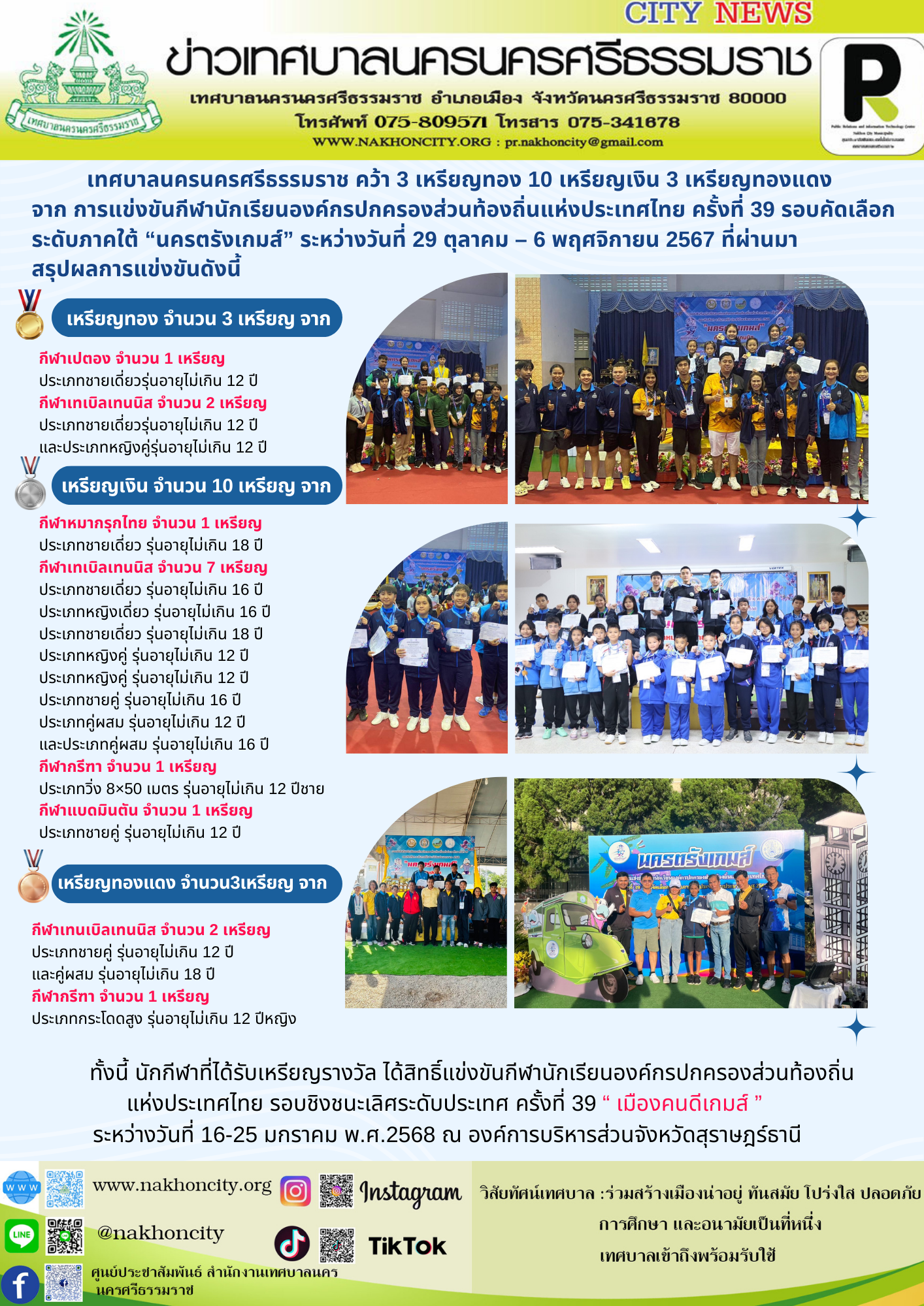 เทศบาลนครนครศรีธรรมราช คว้า 3 เหรียญทอง 10 เหรียญเงิน 3 เหรียญทองแดง จาก การแข่งขันกีฬานักเรียนองค์กรปกครองส่วนท้องถิ่นแห่งประเทศไทย ครั้งที่ 39 รอบคัดเลือก ระดับภาคใต้ “นครตรังเกมส์” ระหว่างวันที่ 29 ตุลาคม – 6 พฤศจิกายน 2567 ที่ผ่านมา สรุปผลการแข่งขันดังนี้ เหรียญทอง จำนวน 3 เหรียญ จาก กีฬาเปตอง จำนวน 1 เหรียญ ประเภทชายเดี่ยวรุ่นอายุไม่เกิน 12 ปี กีฬาเทเบิลเทนนิส จำนวน 2 เหรียญ ประเภทชายเดี่ยวรุ่นอายุไม่เกิน 12 ปี และประเภทหญิงคู่รุ่นอายุไม่เกิน 12 ปี เหรียญเงินจำนวน 10 เหรียญ จาก กีฬาหมากรุกไทย จำนวน 1 เหรียญ ประเภทชายเดี่ยว รุ่นอายุไม่เกิน 18 ปี กีฬาเทเบิลเทนนิส จำนวน 7 เหรียญ ประเภทชายเดี่ยว รุ่นอายุไม่เกิน 16 ปี ประเภทหญิงเดี่ยว รุ่นอายุไม่เกิน 16 ปี ประเภทชายเดี่ยว รุ่นอายุไม่เกิน 18 ปี ประเภทหญิงคู่ รุ่นอายุไม่เกิน 12 ปี ประเภทหญิงคู่ รุ่นอายุไม่เกิน 12 ปี ประเภทชายคู่ รุ่นอายุไม่เกิน 16 ปี ประเภทคู่ผสม รุ่นอายุไม่เกิน 12 ปี และประเภทคู่ผสม รุ่นอายุไม่เกิน 16 ปี กีฬากรีฑา จำนวน 1 เหรียญ ประเภทวิ่ง 8×50 เมตร รุ่นอายุไม่เกิน 12 ปีชาย กีฬาแบดมินตัน จำนวน 1 เหรียญ ประเภทชายคู่ รุ่นอายุไม่เกิน 12 ปี
