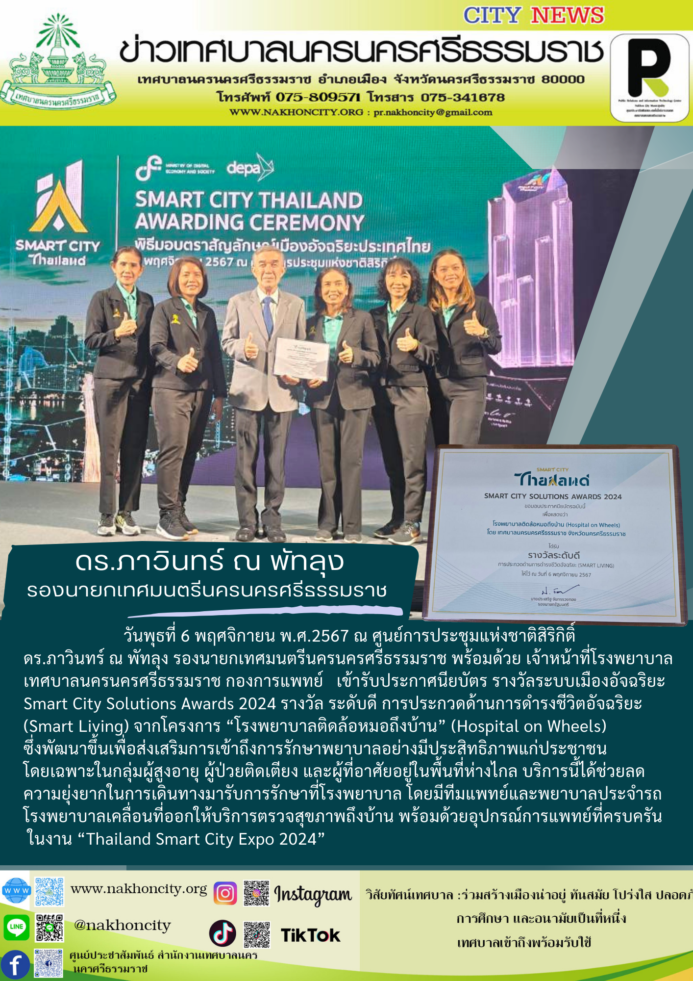 วันพุธ ที่ 6 พฤศจิกายน พ.ศ.2567 ณ ศูนย์การประชุมแห่งชาติสิริกิติ์ ดร.ภาวินทร์ ณ พัทลุง รองนายกเทศมนตรีนครนครศรีธรรมราช พร้อมด้วย เจ้าหน้าที่โรงพยาบาลเทศบาลนครนครศรีธรรมราช กองการแพทย์ เข้ารับประกาศนียบัตร รางวัลระบบเมืองอัจฉริยะ Smart City Solutions Awards 2024 รางวัล ระดับดี การประกวดด้านการดำรงชีวิตอัจฉริยะ (Smart Living) จากโครงการ “โรงพยาบาลติดล้อหมอถึงบ้าน” (Hospital on Wheels) ซึ่งพัฒนาขึ้นเพื่อส่งเสริมการเข้าถึงการรักษาพยาบาลอย่างมีประสิทธิภาพแก่ประชาชน โดยเฉพาะในกลุ่มผู้สูงอายุ ผู้ป่วยติดเตียง และผู้ที่อาศัยอยู่ในพื้นที่ห่างไกล บริการนี้ได้ช่วยลดความยุ่งยากในการเดินทางมารับการรักษาที่โรงพยาบาล โดยมีทีมแพทย์และพยาบาลประจำรถโรงพยาบาลเคลื่อนที่ออกให้บริการตรวจสุขภาพถึงบ้าน พร้อมด้วยอุปกรณ์การแพทย์ที่ครบครัน ในงาน “Thailand Smart City Expo 2024” |