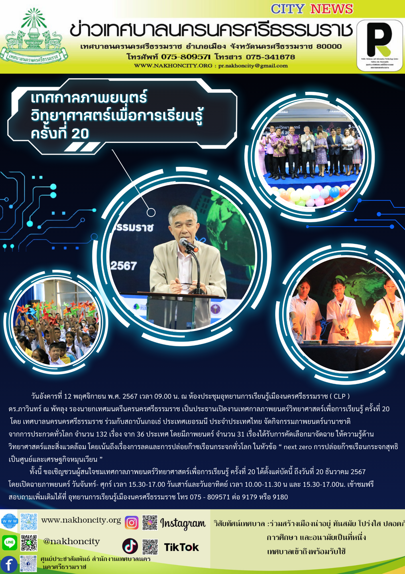 วันอังคารที่ 12 พฤศจิกายน พ.ศ. 2567 เวลา 09.00 น. ณ ห้องประชุมอุทยานการเรียนรู้เมืองนครศรีธรรมราช ( CLP ) ดร.ภาวินทร์ ณ พัทลุง รองนายกเทศมนตรีนครนครศรีธรรมราช เป็นประธานเปิดงานเทศกาลภาพยนตร์วิทยาศาสตร์เพื่อการเรียนรู้ ครั้งที่ 20 โดย เทศบาลนครนครศรีธรรมราช ร่วมกับสถาบันเกอเธ่ ประเทศเยอรมนี ประจำประเทศไทย จัดกิจกรรมภาพยนตร์นานาชาติ จากการประกวดทั่วโลก จำนวน 132 เรื่อง จาก 36 ประเทศ โดยมีภาพยนตร์ จำนวน 31 เรื่องได้รับการคัดเลือกมาจัดฉาย ให้ความรู้ด้านวิทยาศาสตร์และสิ่งแวดล้อม โดยเน้นถึงเรื่องการลดและการปล่อยก๊าซเรือนกระจกทั่วโลก ในหัวข้อ “ next zero การปล่อยก๊าซเรือนกระจกสุทธิเป็นศูนย์และเศรษฐกิจหมุนเวียน ” ทั้งนี้ ขอเชิญชวนผู้สนใจชมเทศกาลภาพยนตร์วิทยาศาสตร์เพื่อการเรียนรู้ ครั้งที่ 20 ได้ตั้งแต่บัดนี้ ถึงวันที่ 20 ธันวาคม 2567 โดยเปิดฉายภาพยนตร์ วันจันทร์- ศุกร์ เวลา 15.30-17.00 วันเสาร์และวันอาทิตย์ เวลา 10.00-11.30น และ 15.30-17.00น. เข้าชมฟรี สอบถามเพิ่มเติมได้ที่ อุทยานการเรียนรู้เมืองนครศรีธรรมราช โทร 075 - 809571 ต่อ 9179 หรือ 9180 |