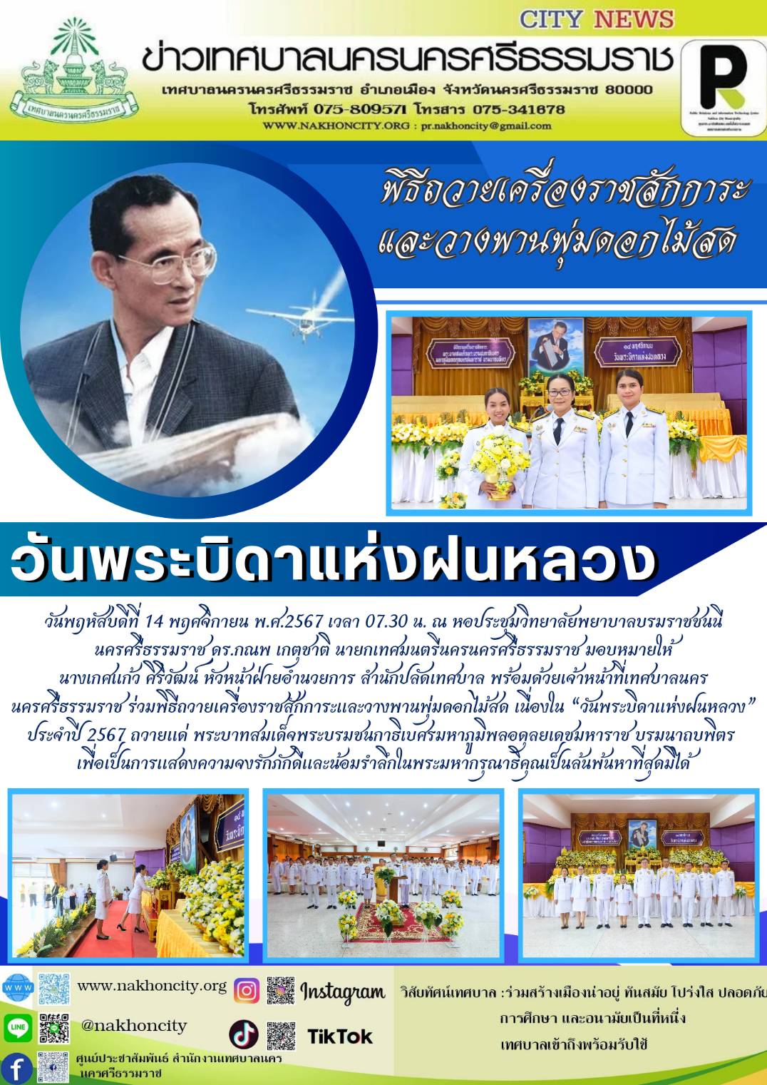 นางเกศแก้ว ศิริวัฒน์ หัวหน้าฝ่ายอำนวยการ สำนักปลัดเทศบาล พร้อมด้วยเจ้าหน้าที่เทศบาลนครนครศรีธรรมราช ร่วมพิธีถวายเครื่องราชสักการะและวางพานพุ่มดอกไม้สด เนื่องใน “วันพระบิดาแห่งฝนหลวง” ประจำปี 2567 |