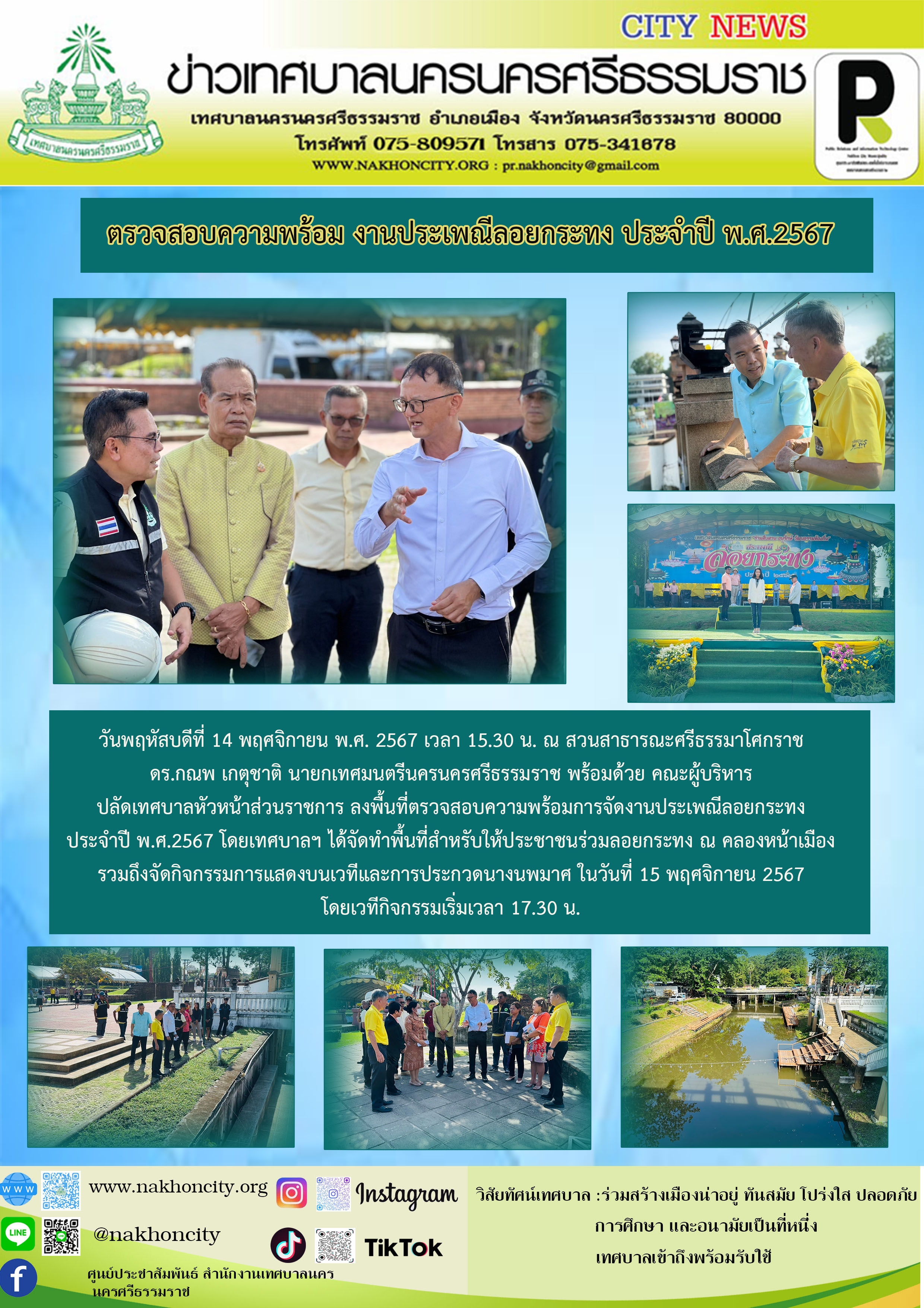 นายกเทศมนตรีนครนครศรีธรรมราช พร้อมด้วย คณะผู้บริหาร ปลัดเทศบาลหัวหน้าส่วนราชการ ลงพื้นที่ตรวจสอบความพร้อมการจัดงานประเพณีลอยกระทง ประจำปี พ.ศ.2567 |