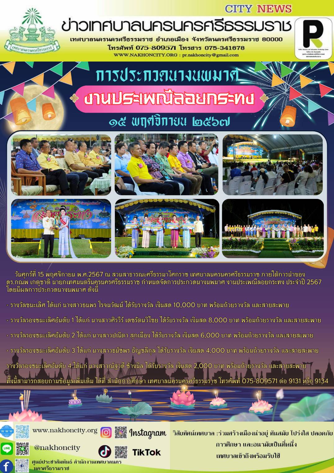 วันศุกร์ที่ 15 พฤศจิกายน พ.ศ.2567 ณ สวนสาธารณะศรีธรรมาโศกราช เทศบาลนครนครศรีธรรมราช ภายใต้การนำของ ดร.กณพ เกตุชาติ นายกเทศมนตรีนครนครศรีธรรมราช กำหนดจัดการประกวดนางนพมาศ งานประเพณีลอยกระทง ประจำปี 2567 โดยมีผลการประกวดนางนพมาศ ดังนี้