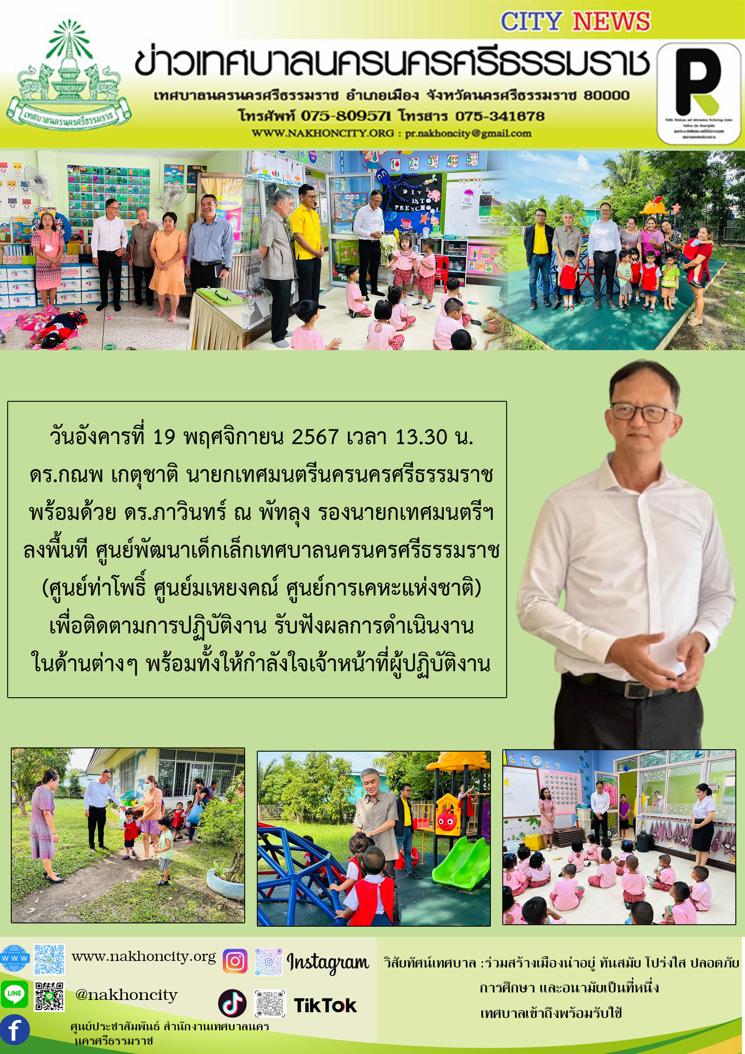 วันอังคารที่ 19 พฤศจิกายน 2567 เวลา 13.30 น. ดร.กณพ เกตุชาติ นายกเทศมนตรีนครนครศรีธรรมราช พร้อมด้วย ดร.ภาวินทร์ ณ พัทลุง รองนายกเทศมนตรีฯ ลงพื้นที ศูนย์พัฒนาเด็กเล็กเทศบาลนครนครศรีธรรมราช (ศูนย์ท่าโพธิ์ ศูนย์มเหยงคณ์ ศูนย์การเคหะแห่งชาติ) เพื่อติดตามการปฏิบัติงาน รับฟังผลการดำเนินงานในด้านต่างๆ พร้อมทั้งให้กำลังใจเจ้าหน้าที่ผู้ปฏิบัติงาน