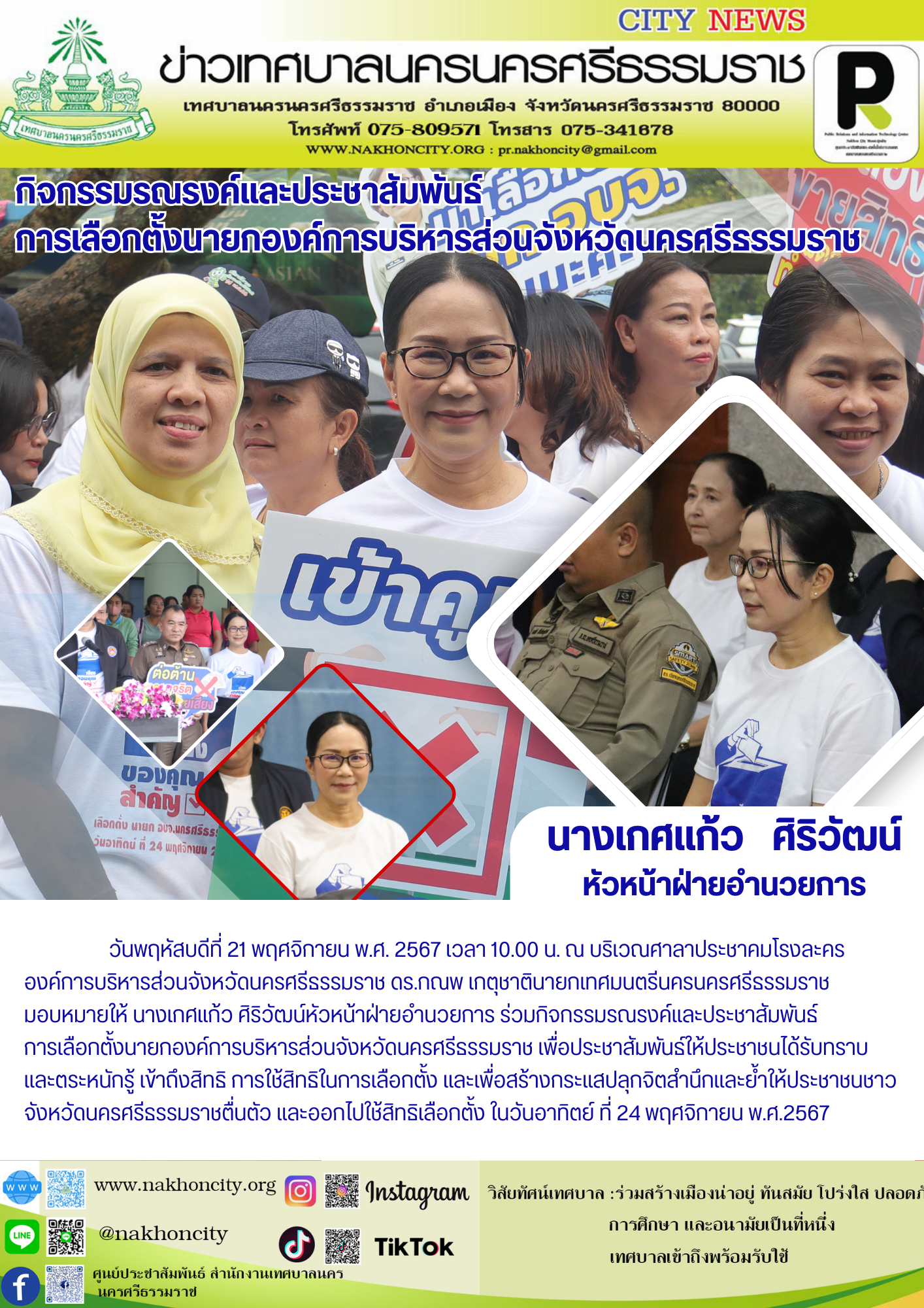 นางเกศแก้ว ศิริวัฒน์ หัวหน้าฝ่ายอำนวยการ ร่วมกิจกรรมรณรงค์และประชาสัมพันธ์การเลือกตั้งนายกองค์การบริหารส่วนจังหวัดนครศรีธรรมราช |