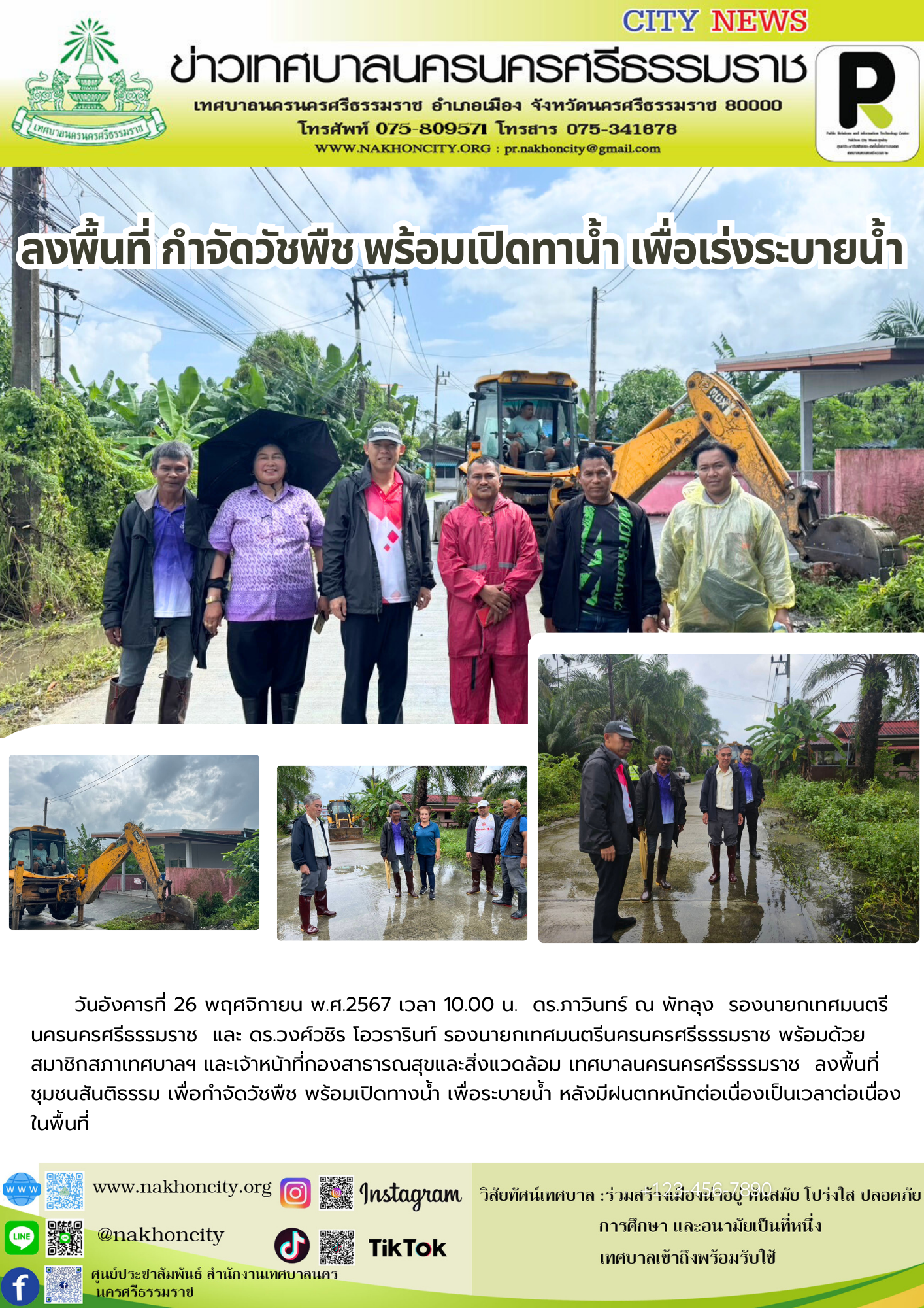 วันอังคารที่ 26 พฤศจิกายน พ.ศ.2567 เวลา 10.00 น. ดร.ภาวินทร์ ณ พัทลุง รองนายกเทศมนตรีนครนครศรีธรรมราช และ ดร.วงศ์วชิร โอวรารินท์ รองนายกเทศมนตรีนครนครศรีธรรมราช พร้อมด้วยสมาชิกสภาเทศบาลฯ และเจ้าหน้าที่กองสาธารณสุขและสิ่งแวดล้อม เทศบาลนครนครศรีธรรมราช ลงพื้นที่ ชุมชนสันติธรรม เพื่อกำจัดวัชพืช พร้อมเปิดทางน้ำ เพื่อระบายน้ำ หลังมีฝนตกหนักต่อเนื่องเป็นเวลาต่อเนื่องในพื้นที่ ข่าว/แสงจันทร์ |