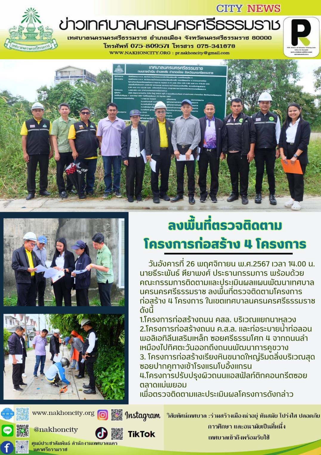 วันอังคารที่ 26 พฤศจิกายน พ.ศ.2567 เวลา 14.00 น. นายธีระพันธ์ ฑียาพงศ์ ประธานกรรมการ พร้อมด้วยคณะกรรมการติดตามและประเมินผลแผนพัฒนาเทศบาลนครนครศรีธรรมราช ลงพื้นที่ตรวจติดตามโครงการก่อสร้าง 4 โครงการ ในเขตเทศบาลนครนครศรีธรรมราช ดังนี้ 1.โครงการก่อสร้างถนน คสล. บริเวณแยกนาหลวง 2.โครงการก่อสร้างถนน ค.ส.ล. และท่อระบายน้ำท่อลอนพอลิเอทิลีนเสริมเหล็ก ซอยศรีธรรมโศก 4 จากถนนลำเหมืองไปทิศตะวันออกถึงถนนพัฒนาการคูขวาง 3. โครงการก่อสร้างเรียงหินขนาดใหญ่ริมตลิ่งบริเวณสุดซอยปากคูทางเข้าโรงแรมโบอิ้งแกรน 4.โครงการปรับปรุงผิวถนนแอสฟัลท์ติกคอนกรีตซอยตลาดแม่พยอม เพื่อตรวจติดตามและประเมินผลโครงการดังกล่าว ……….. ภาพ//จันทร์จิรา |