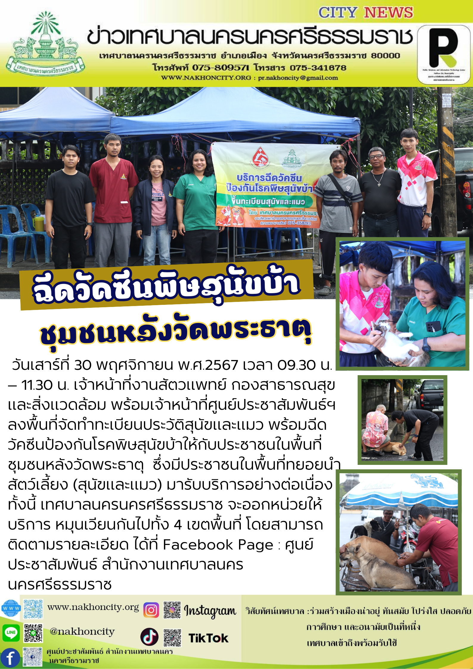 วันเสาร์ที่ 30 พฤศจิกายน พ.ศ.2567 เวลา 09.30 น. – 11.30 น. เจ้าหน้าที่งานสัตวแพทย์ กองสาธารณสุขและสิ่งแวดล้อม พร้อมเจ้าหน้าที่ศูนย์ประชาสัมพันธ์ฯ ลงพื้นที่จัดทำทะเบียนประวัติสุนัขและแมว พร้อมฉีดวัคซีนป้องกันโรคพิษสุนัขบ้าให้กับประชาชนในพื้นที่ชุมชนหลังวัดพระธาตุ ซึ่งมีประชาชนในพื้นที่ทยอยนำสัตว์เลี้ยง (สุนัขและแมว) มารับบริการอย่างต่อเนื่อง ทั้งนี้ เทศบาลนครนครศรีธรรมราช จะออกหน่วยให้บริการ หมุนเวียนกันไปทั้ง 4 เขตพื้นที่ โดยสามารถติดตามรายละเอียด ได้ที่ Facebook Page : ศูนย์ประชาสัมพันธ์ สำนักงานเทศบาลนครนครศรีธรรมราช |