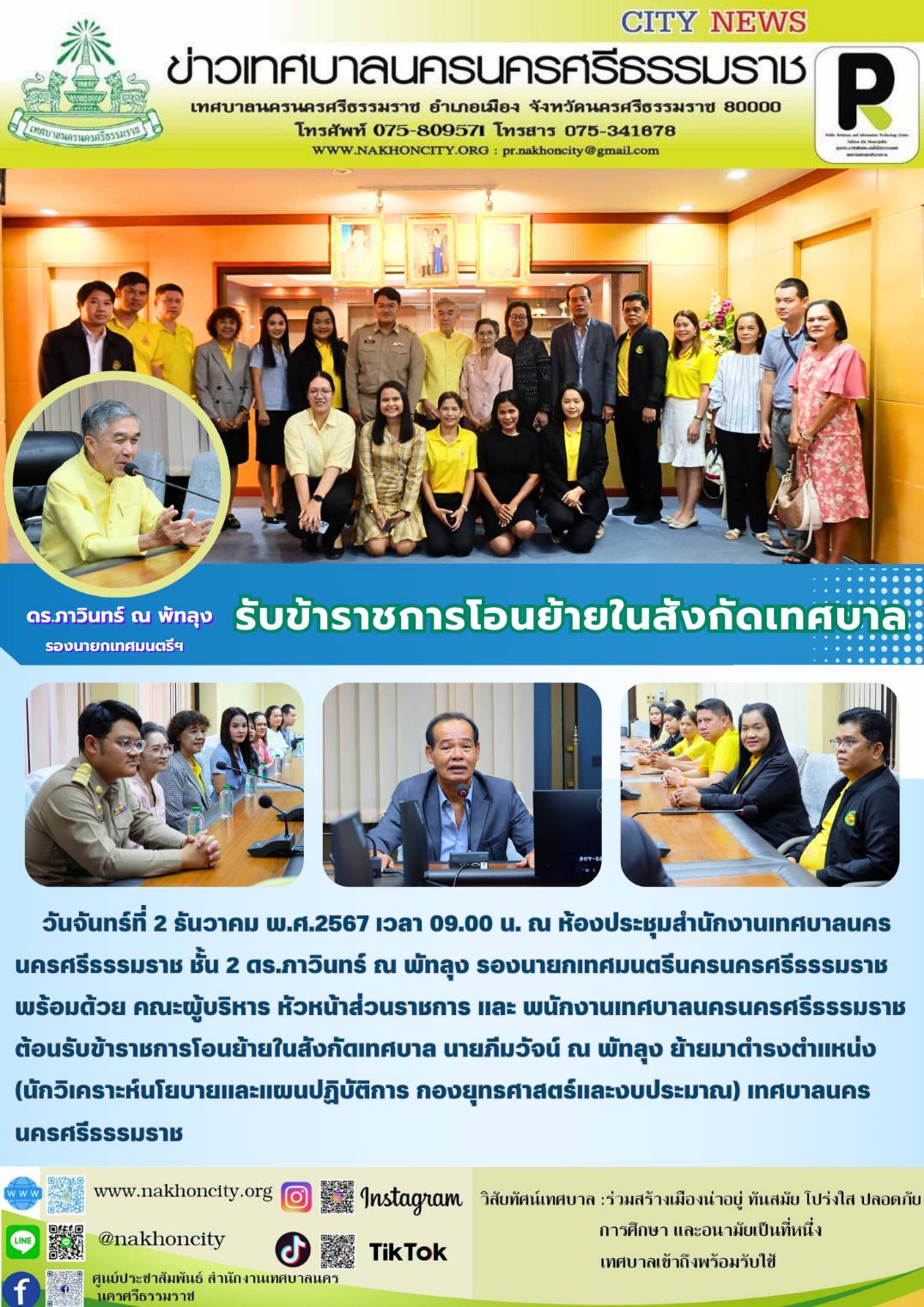 ดร.ภาวินทร์ ณ พัทลุง รองนายกเทศมนตรีนครนครศรีธรรมราช ต้อนรับข้าราชการโอนย้ายในสังกัดเทศบาล |