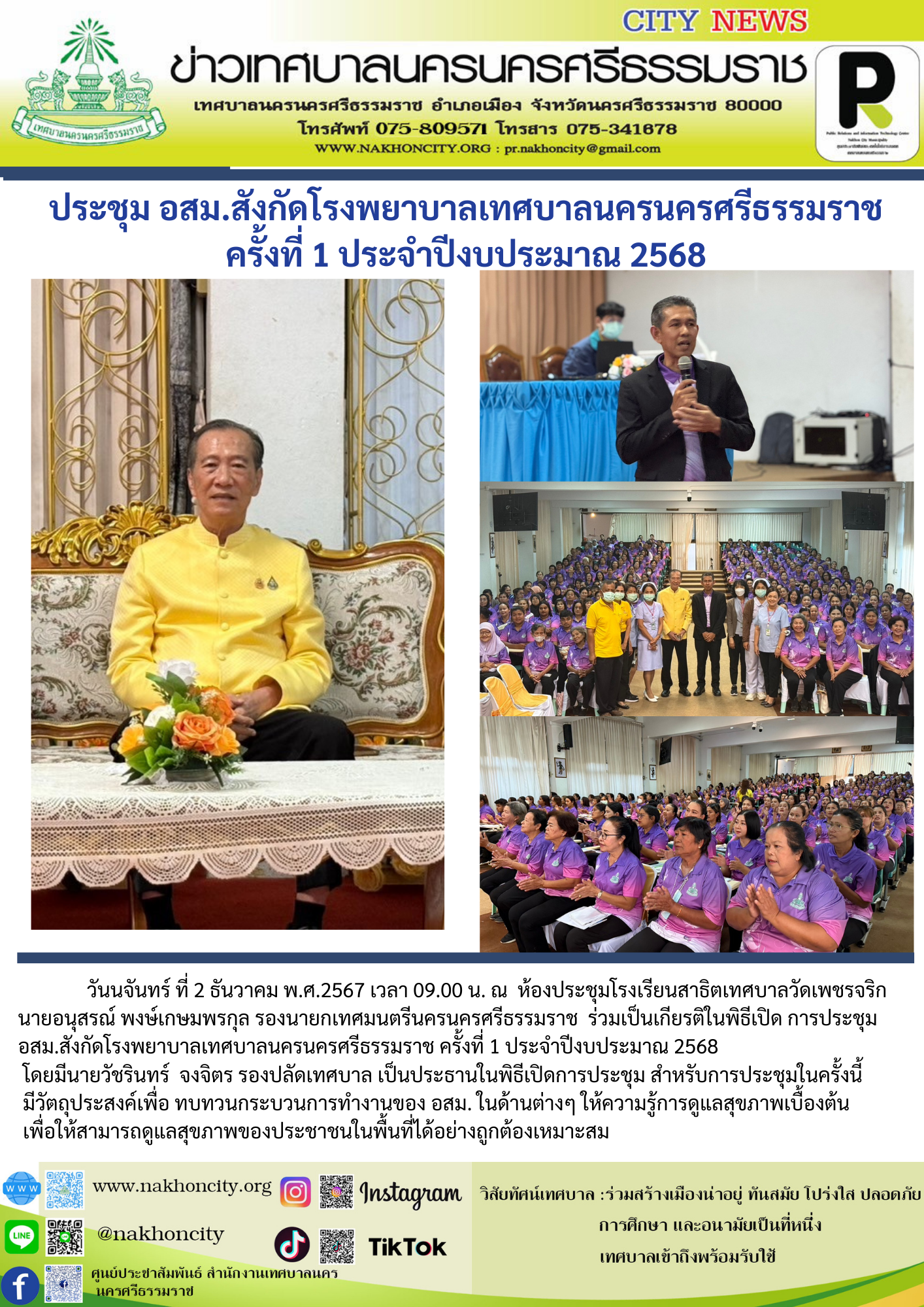 นายอนุสรณ์ พงษ์เกษมพรกุล รองนายกเทศมนตรีนครนครศรีธรรมราช ร่วมเป็นเกียรติในพิธีเปิด การประชุม อสม.สังกัดโรงพยาบาลเทศบาลนครนครศรีธรรมราช ครั้งที่ 1 ประจำปีงบประมาณ 2568 |