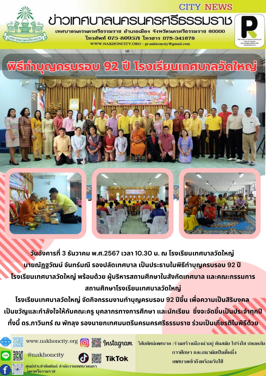 วันอังคารที่ 3 ธันวาคม พ.ศ.2567 เวลา 10.30 น. ณ โรงเรียนเทศบาลวัดใหญ่ นายณัฏฐวัฒน์ จันทร์มณี รองปลัดเทศบาล เป็นประธานในพิธีทำบุญครบรอบ 92 ปี โรงเรียนเทศบาลวัดใหญ่ พร้อมด้วย ผู้บริหารสถานศึกษาในสังกัดเทศบาล และคณะกรรมการสถานศึกษาโรงเรียนเทศบาลวัดใหญ่ โรงเรียนเทศบาลวัดใหญ่ จัดกิจกรรมงานทำบุญครบรอบ 92 ปีขึ้น เพื่อความเป็นสิริมงคล เป็นขวัญและกำลังใจให้กับคณะครู บุคลากรทางการศึกษา และนักเรียน ซึ่งจะจัดขึ้นเป็นประจำทุกปี ทั้งนี้ ดร.ภาวินทร์ ณ พัทลุง รองนายกเทศมนตรีนครนครศรีธรรมราช ร่วมเป็นเกียรติในพิธีด้วย ................ ภาพ//ข่าว//จันทร์จิรา ตรวจทาน//ฐิตินันท์ |