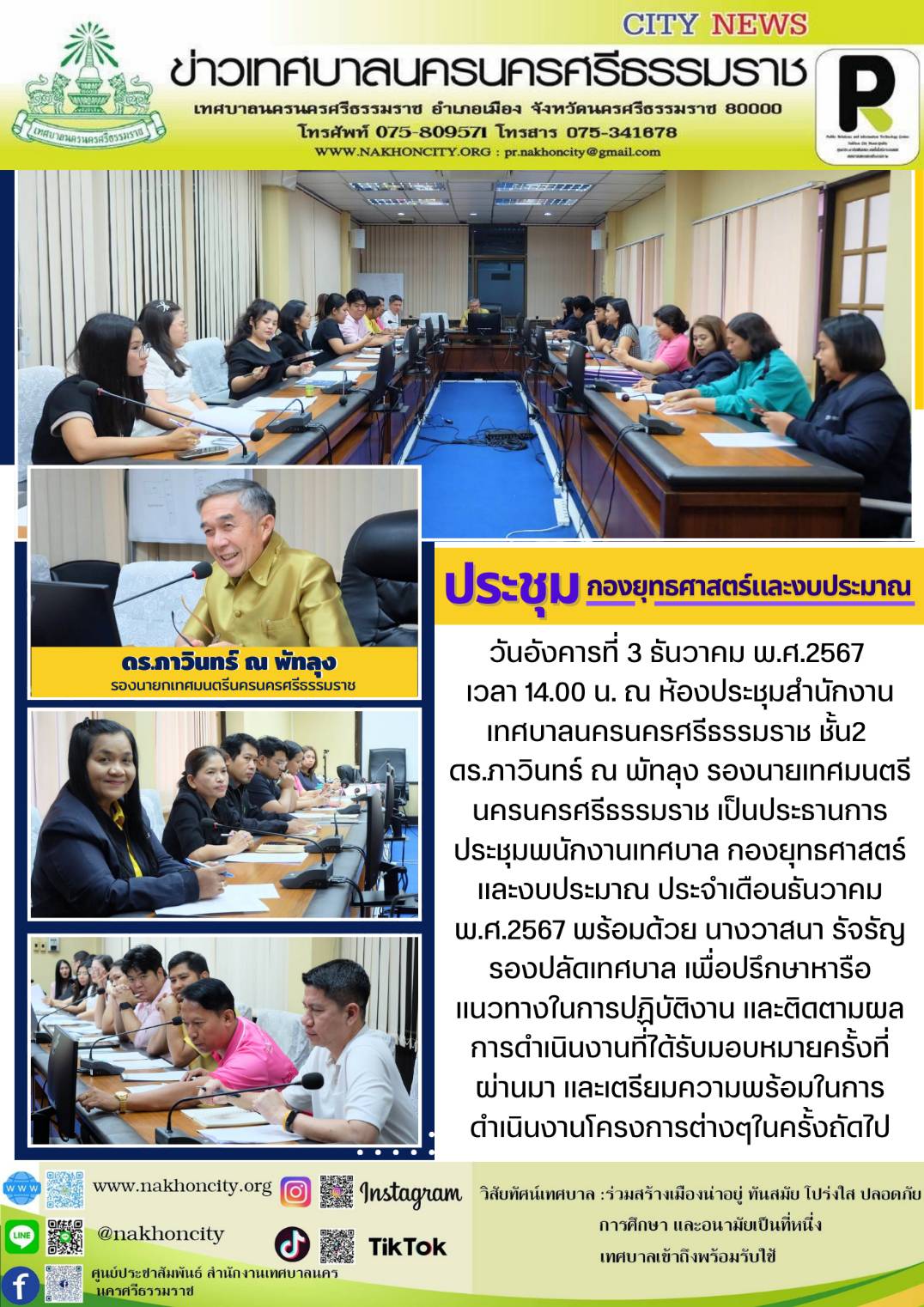 ดร.ภาวินทร์ ณ พัทลุง รองนายกเทศมนตรีนครนครศรีธรรมราช เป็นประธานการประชุมพนักงานเทศบาล กองยุทธศาสตร์และงบประมาณ |