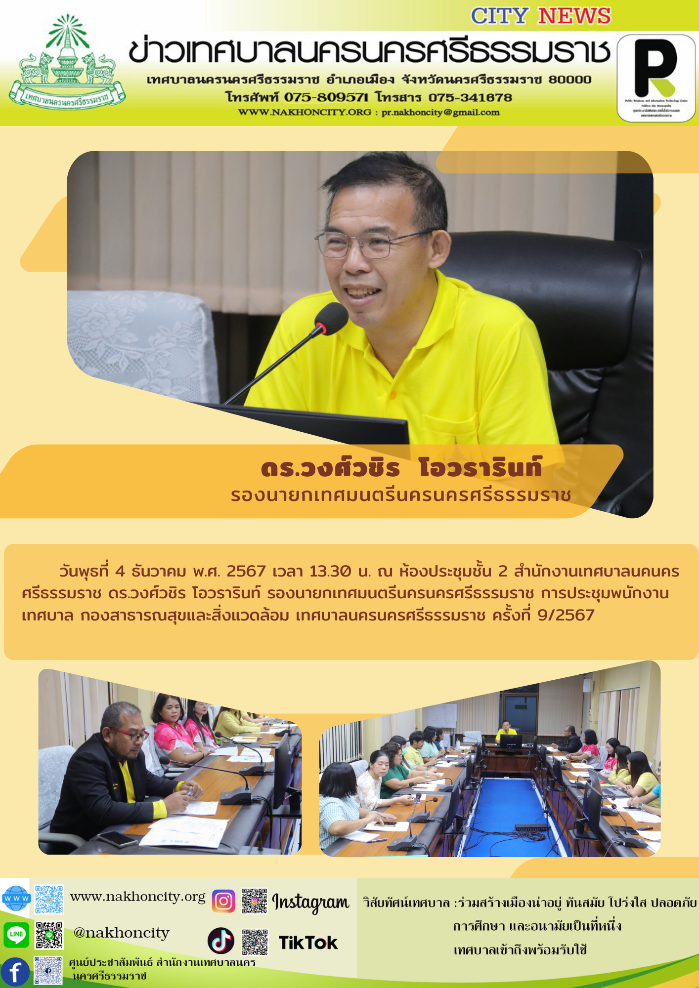 ดร.วงศ์วชิร โอวรารินท์ รองนายกเทศมนตรีนครนครศรีธรรมราช การประชุมพนักงานเทศบาล กองสาธารณสุขและสิ่งแวดล้อม เทศบาลนครนครศรีธรรมราช ครั้งที่ 9/2567 |