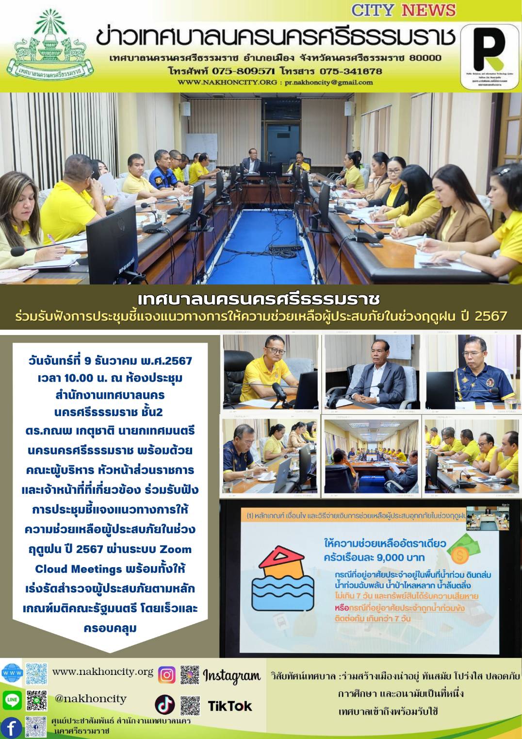 เทศบาลนครนครศรีธรรมราช เกี่ยวข้อง ร่วมรับฟังการประชุมชี้แจงแนวทางการให้ความช่วยเหลือผู้ประสบภัยในช่วงฤดูฝน ปี 2567 |