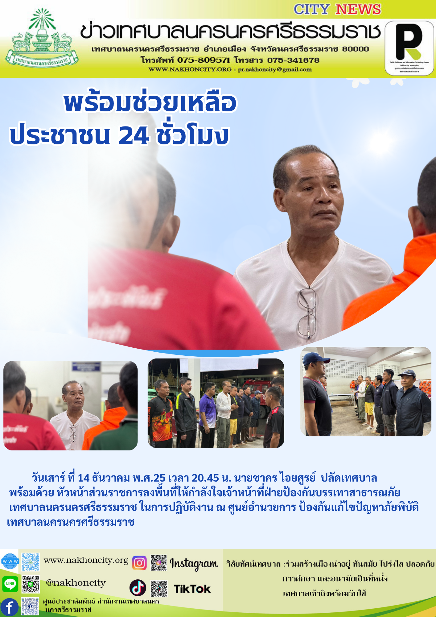 วันเสาร์ ที่ 14 ธันวาคม พ.ศ.2567 เวลา 20.45 น. นายชาคร ไอยศูรย์ ปลัดเทศบาล พร้อมด้วย หัวหน้าส่วนราชการลงพื้นที่ให้กำลังใจเจ้าหน้าที่ฝ่ายป้องกันบรรเทาสาธารณภัย เทศบาลนครนครศรีธรรมราช ในการปฎิบัติงาน ณ ศูนย์อำนวยการ ป้องกันแก้ไขปัญหาภัยพิบัติ เทศบาลนครนครศรีธรรมราช ภาพ/ณธัญญ์ |