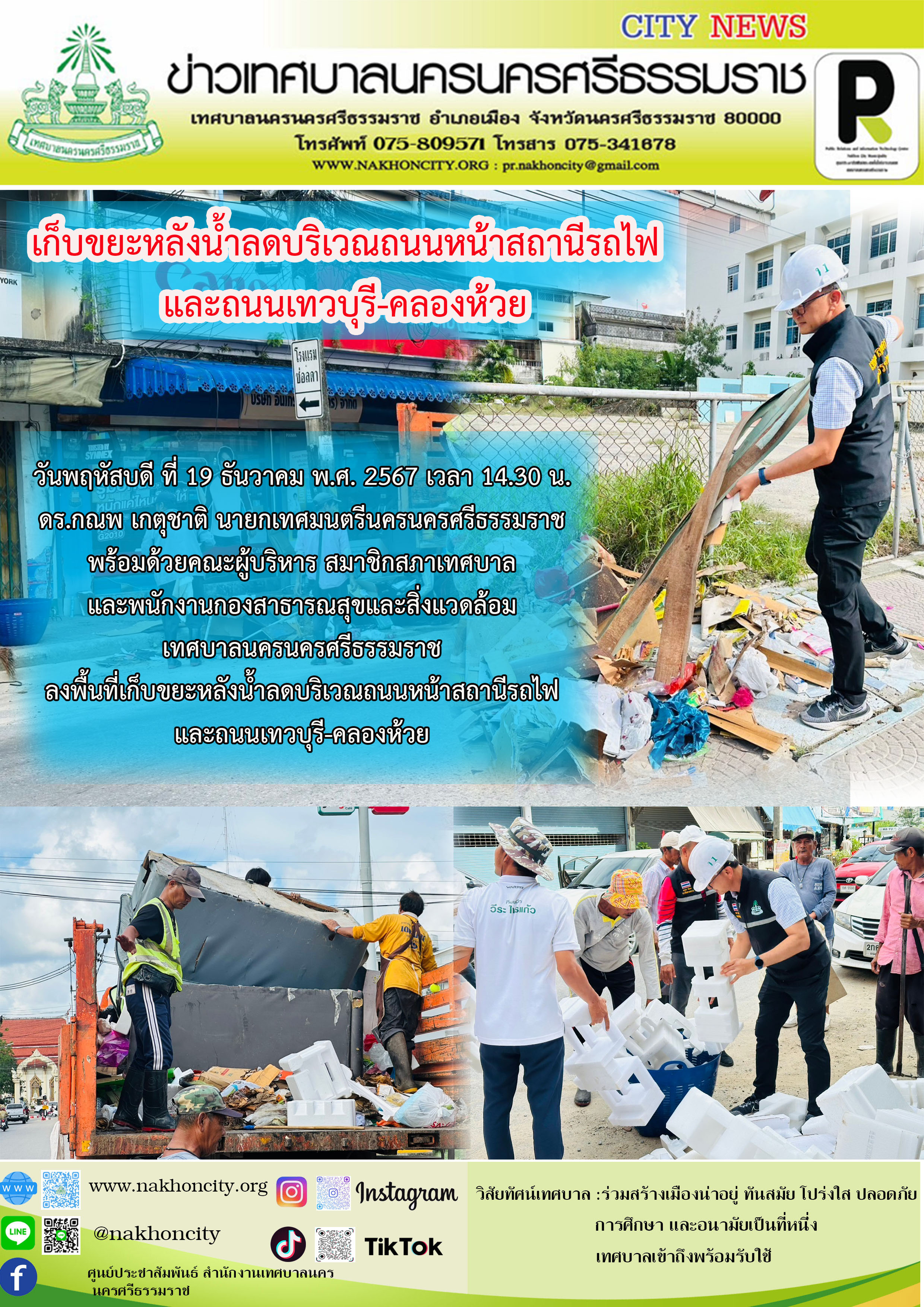 นายกเทศมนตรีนครนครศรีธรรมราช พร้อมด้วยคณะผู้บริหาร สมาชิกสภาเทศบาล และพนักงานกองสาธารณสุขและสิ่งแวดล้อม เทศบาลนครนครศรีธรรมราช ลงพื้นที่เก็บขยะหลังน้ำลดบริเวณถนนหน้าสถานีรถไฟ และถนนเทวบุรี-คลองห้วย |