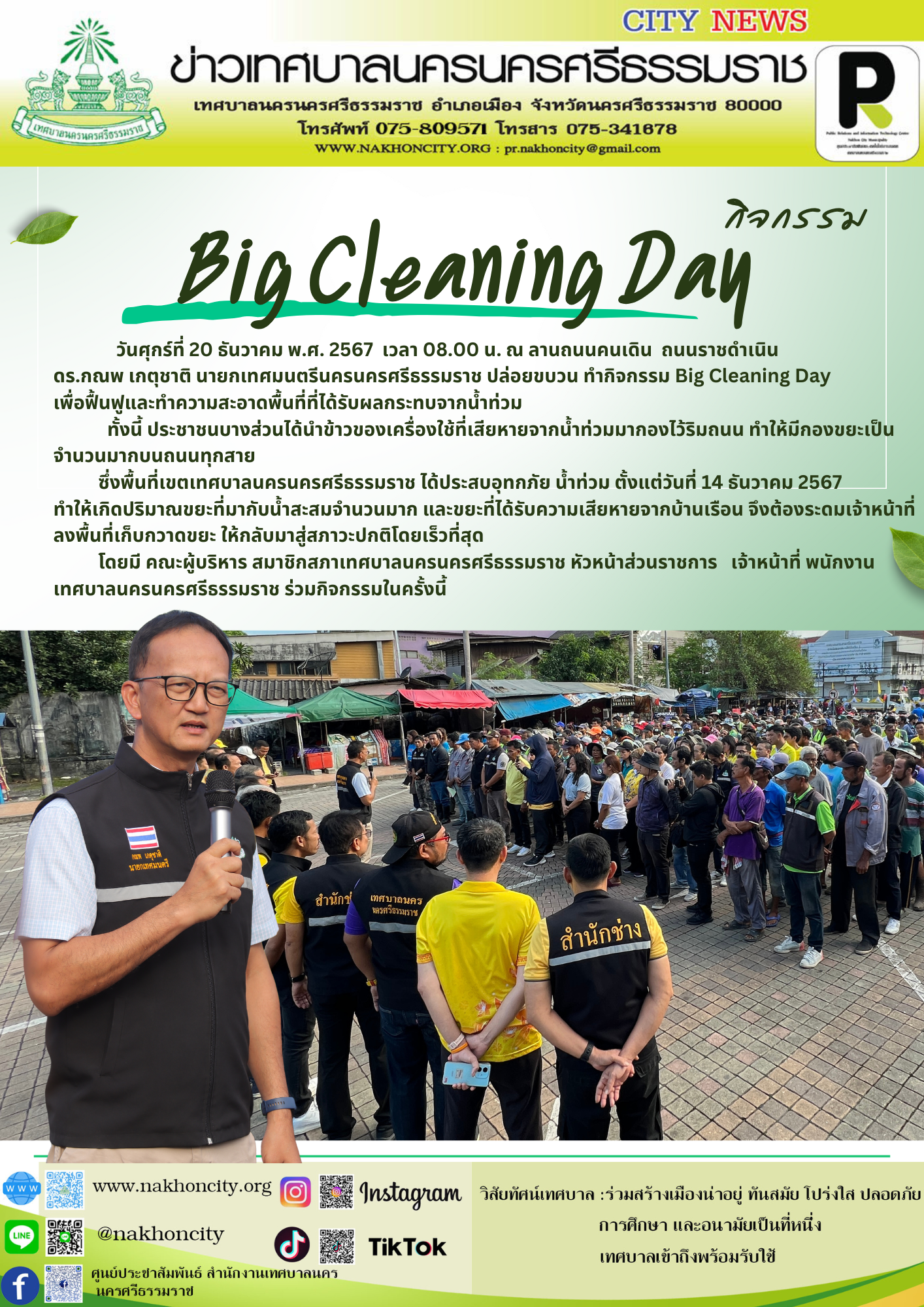 วันศุกร์ที่ 20 ธันวาคม พ.ศ. 2567 เวลา 08.00 น. ณ ลานถนนคนเดิน ดร.กณพ เกตุชาติ นายกเทศมนตรีนครนครศรีธรรมราช ปล่อยขบวน ทำกิจกรรม Big Cleaning Day เพื่อฟื้นฟูและทำความสะอาดพื้นที่ที่ได้รับผลกระทบจากน้ำท่วม ทั้งนี้ ประชาชนบางส่วนได้นำข้าวของเครื่องใช้ที่เสียหายจากน้ำท่วมมากองไว้ริมถนน ทำให้มีกองขยะเป็นจำนวนมากบนถนนทุกสาย โดยพื้นที่เขตเทศบาลนครนครศรีธรรมราช ได้ประสบอุทกภัย น้ำท่วม ตั้งแต่วันที่ 14 ธันวาคม 2567 ทำให้เกิดปริมาณขยะที่มากับน้ำสะสมจำนวนมาก และขยะที่ได้รับความเสียหายจากบ้านเรือน จึงต้องระดมเจ้าหน้าที่ลงพื้นที่เก็บกวาดขยะ ให้กลับมาสู่สภาวะปกติโดยเร็วที่สุด โดยมี คณะผู้บริหาร สมาชิกสภาเทศบาลนครนครศรีธรรมราช หัวหน้าส่วนราชการ เจ้าหน้าที่ พนักงาน เทศบาลนครนครศรีธรรมราช ร่วมกิจกรรมในครั้งนี้ |