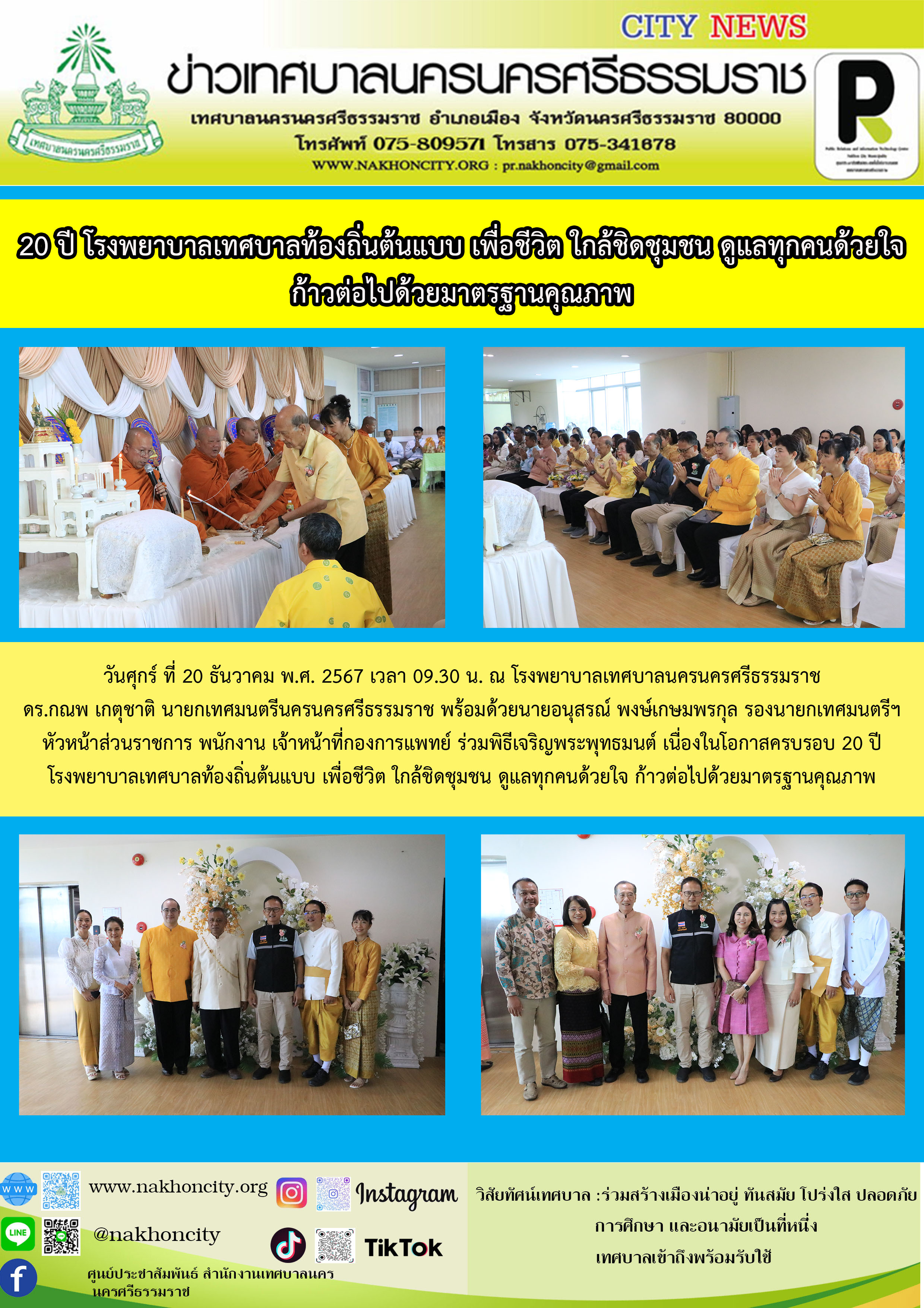 นายกเทศมนตรีนครนครศรีธรรมราช พร้อมด้วยนายอนุสรณ์ พงษ์เกษมพรกุล รองนายกเทศมนตรีฯ หัวหน้าส่วนราชการ พนักงาน เจ้าหน้าที่กองการแพทย์ ร่วมพิธีเจริญพระพุทธมนต์ เนื่องในโอกาสครบรอบ 20 ปี โรงพยาบาลเทศบาลท้องถิ่นต้นแบบ |