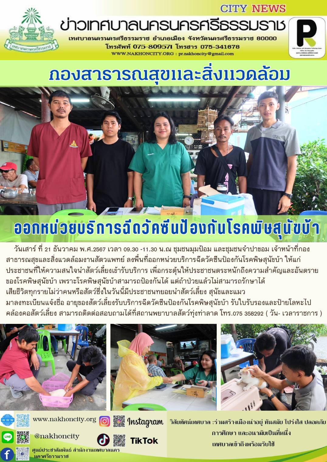 วันเสาร์ ที่ 21 ธันวาคม พ.ศ.2567 เวลา 09.30 -11.30 น. ณ ชุมชนมุมป้อม และชุมชนจำปาขอม เจ้าหน้าที่กองสาธารณสุขและสิ่งแวดล้อมงานสัตวแพทย์ ลงพื้นที่ออกหน่วยบริการฉีดวัคซีนป้องกันโรคพิษสุนัขบ้า ให้แก่ประชาชนที่ให้ความสนใจนำสัตว์เลี้ยงเข้ารับบริการ เพื่อกระตุ้นให้ประชาชนตระหนักถึงความสำคัญและอันตรายของโรคพิษสุนัขบ้า เพราะโรคพิษสุนัขบ้าสามารถป้องกันได้ แต่ถ้าป่วยแล้วไม่สามารถรักษาได้ เสียชีวิตทุกรายไม่ว่าคนหรือสัตว์ ซึ่งในวันนี้มีประชาชนทยอยนำสัตว์เลี้ยง สุนัขและแมว มาลงทะเบียนแจ้งชื่อ อายุของสัตว์เลี้ยงรับบริการฉีดวัคซีนป้องกันโรคพิษสุนัขบ้า รับใบรับรองและป้ายโลหะไปคล้องคอสัตว์เลี้ยง สามารถติดต่อสอบถามได้ที่สถานพยาบาลสัตว์ทุ่งท่าลาด โทร.075 358292 ( วัน- เวลาราชการ ) ……….. ภาพ//ข่าว//จันทร์จิรา