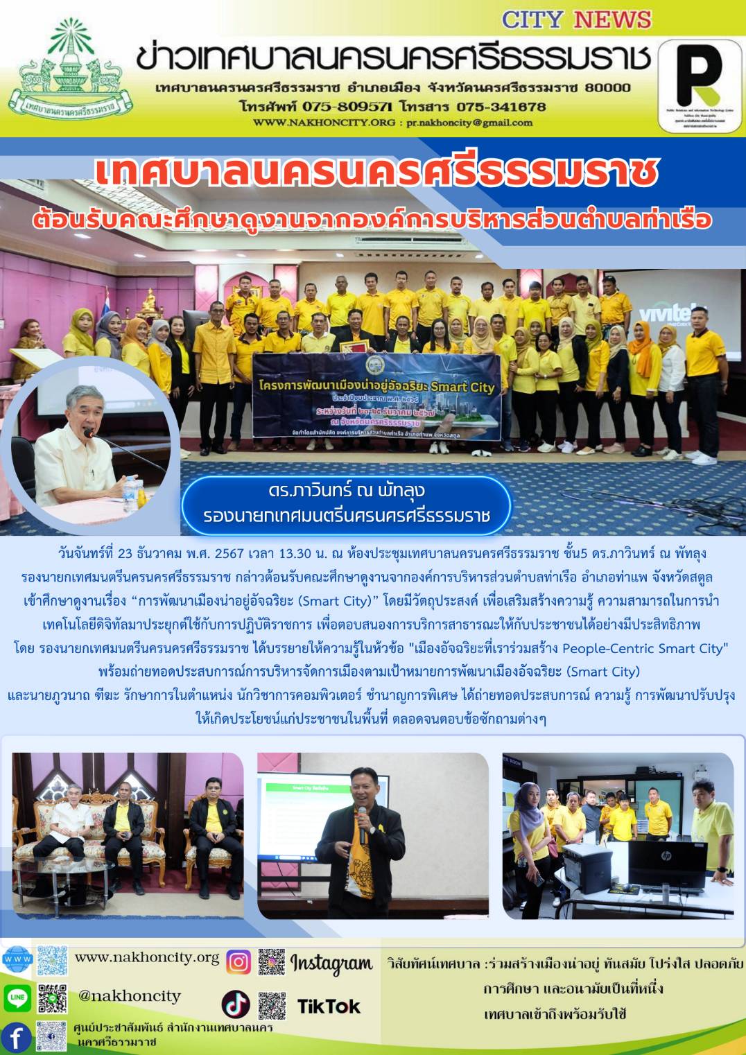 วันจันทร์ที่ 23 ธันวาคม พ.ศ. 2567 เวลา 13.30 น. ณ ห้องประชุมเทศบาลนครนครศรีธรรมราช ชั้น5 ดร.ภาวินทร์ ณ พัทลุง รองนายกเทศมนตรีนครนครศรีธรรมราช กล่าวต้อนรับคณะศึกษาดูงานจากองค์การบริหารส่วนตำบลท่าเรือ อำเภอท่าแพ จังหวัดสตูล เข้าศึกษาดูงานเรื่อง “การพัฒนาเมืองน่าอยู่อัจฉริยะ (Smart City)” โดยมีวัตถุประสงค์ เพื่อเสริมสร้างความรู้ ความสามารถในการนำเทคโนโลยีดิจิทัลมาประยุกต์ใช้กับการปฏิบัติราชการ เพื่อตอบสนองการบริการสาธารณะให้กับประชาชนได้อย่างมีประสิทธิภาพ โดย รองนายกเทศมนตรีนครนครศรีธรรมราช ได้บรรยายให้ความรู้ในห้วข้อ "เมืองอัจฉริยะที่เราร่วมสร้าง People-Centric Smart City" พร้อมถ่ายทอดประสบการณ์การบริหารจัดการเมืองตามเป้าหมายการพัฒนาเมืองอัจฉริยะ (Smart City) และนายภูวนาถ ฑีฆะ รักษาการในตำแหน่ง นักวิชาการคอมพิวเตอร์ ชำนาญการพิเศษ ได้ถ่ายทอดประสบการณ์ ความรู้ การพัฒนาปรับปรุงให้เกิดประโยชน์แก่ประชาชนในพื้นที่ ตลอดจนตอบข้อซักถามต่างๆ ............. ภาพ//ข่าว//จันทร์จิรา |