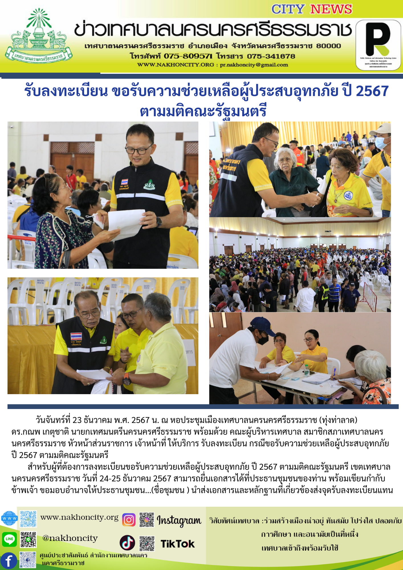 ดร.กณพ เกตุชาติ นายกเทศมนตรีนครนครศรีธรรมราช พร้อมด้วย คณะผู้บริหารเทศบาล สมาชิกสภาเทศบาลนครนครศรีธรรมราช หัวหน้าส่วนราชการ เจ้าหน้าที่ ให้บริการรับลงทะเบียน กรณีขอรับความช่วยเหลือผู้ประสบอุทกภัย ปี 2567 ตามมติคณะรัฐมนตรี |