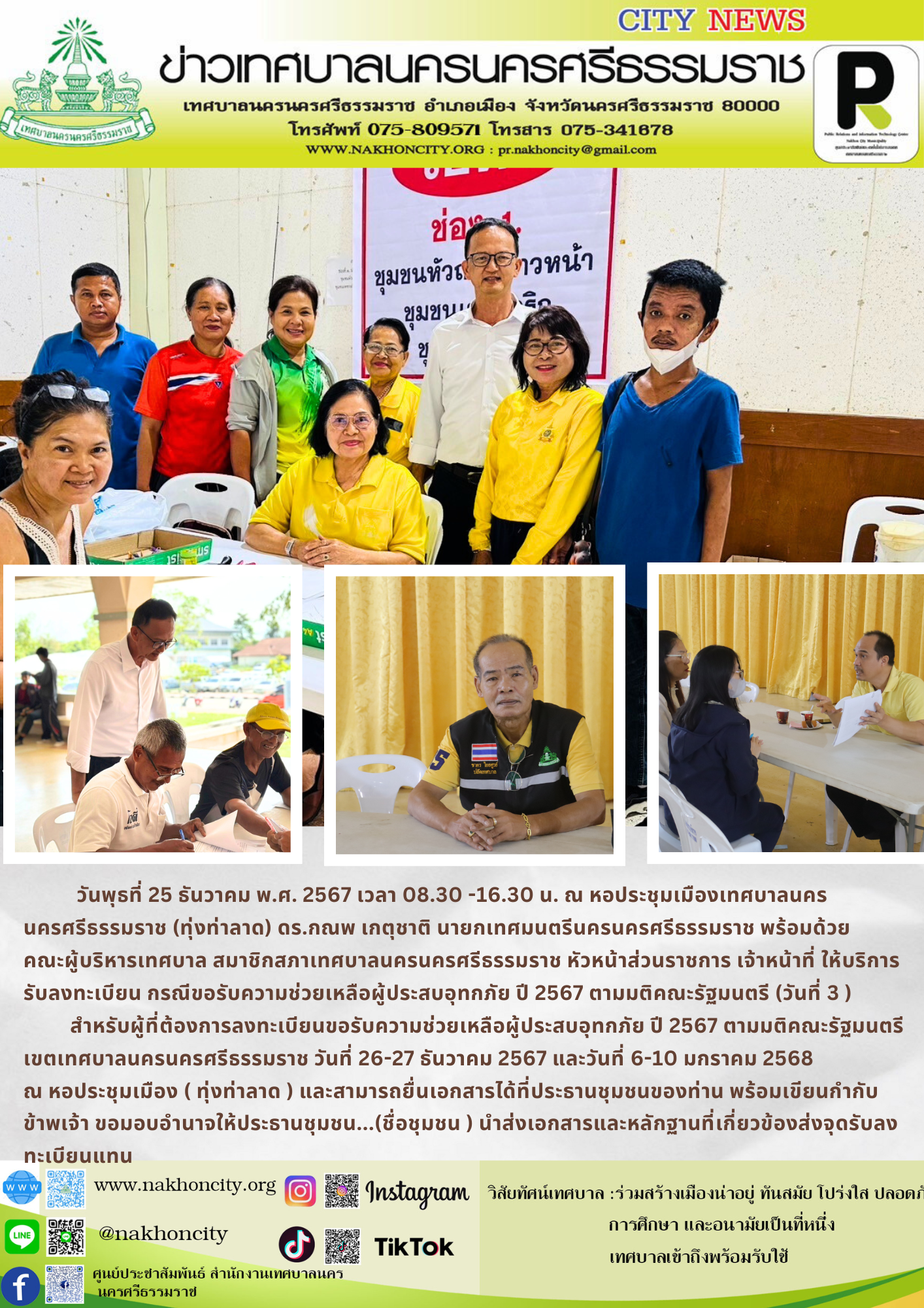 ดร.กณพ เกตุชาติ นายกเทศมนตรีนครนครศรีธรรมราช พร้อมด้วย คณะผู้บริหารเทศบาล สมาชิกสภาเทศบาลนครนครศรีธรรมราช หัวหน้าส่วนราชการ เจ้าหน้าที่ ให้บริการ รับลงทะเบียน กรณีขอรับความช่วยเหลือผู้ประสบอุทกภัย ปี 2567 ตามมติคณะรัฐมนตรี (วันที่ 3 ) |