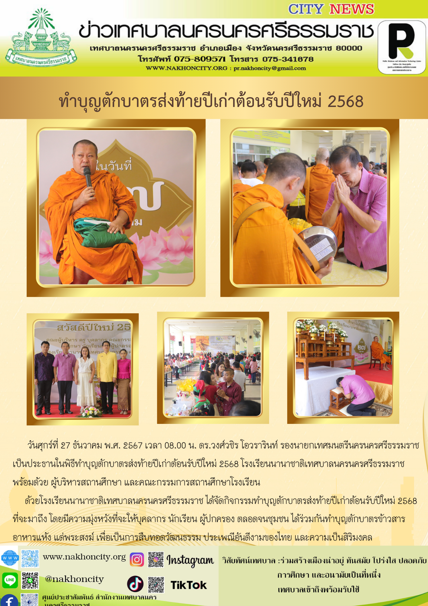 ดร.วงศ์วชิร โอวรารินท์ รองนายกเทศมนตรีนครนครศรีธรรมราช เป็นประธานในพิธีทำบุญตักบาตรส่งท้ายปีเก่าต้อนรับปีใหม่ 2568 โรงเรียนนานาชาติเทศบาลนครนครศรีธรรมราช |