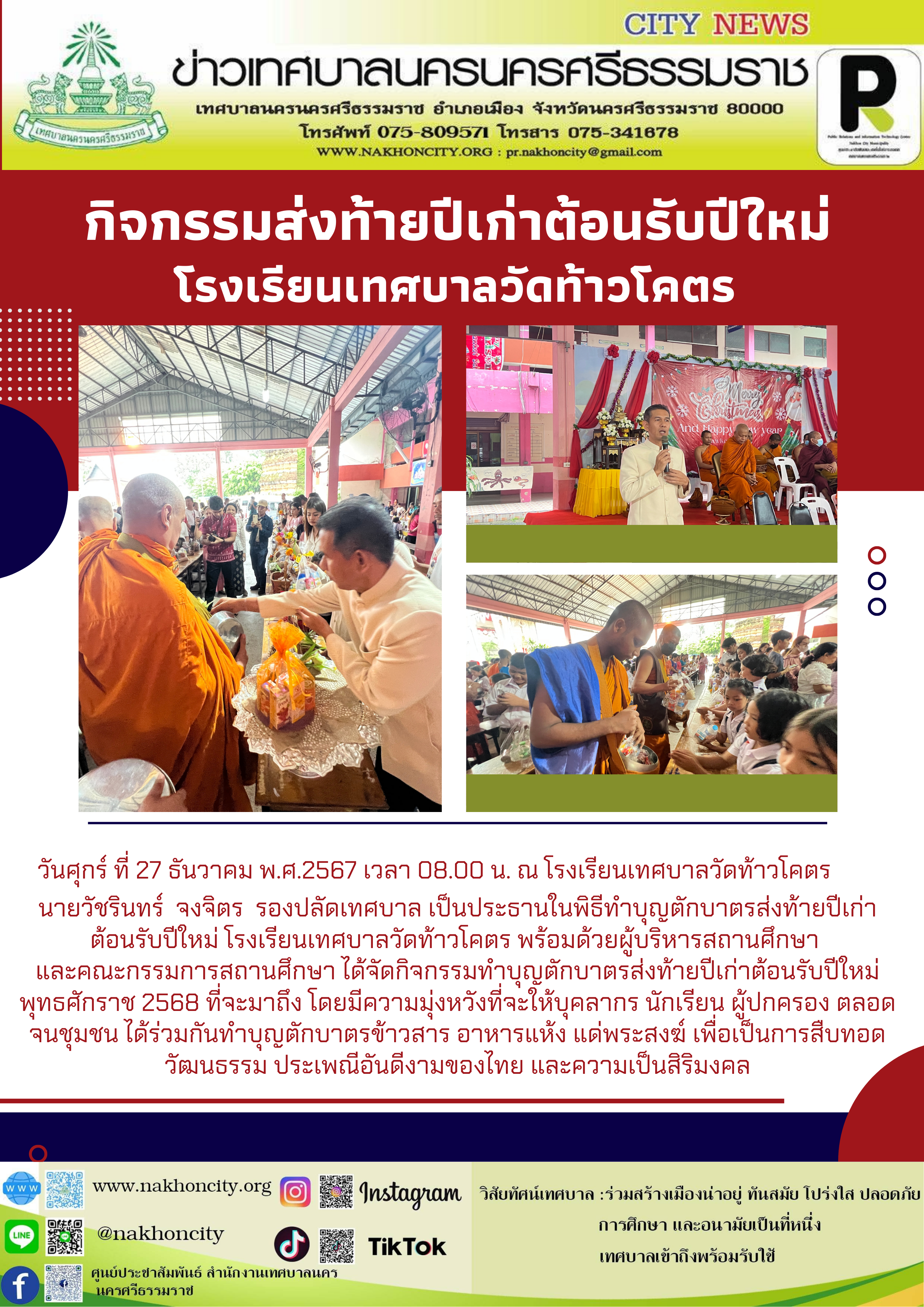 วันศุกร์ ที่ 27 ธันวาคม พ.ศ.2567 เวลา 08.00 น. ณ โรงเรียนเทศบาลวัดท้าวโคตร นายวัชรินทร์ จงจิตร รองปลัดเทศบาล เป็นประธานในพิธีทำบุญตักบาตรส่งท้ายปีเก่าต้อนรับปีใหม่ โรงเรียนเทศบาลวัดท้าวโคตร พร้อมด้วยผู้บริหารสถานศึกษาและคณะกรรมการสถานศึกษา ได้จัดกิจกรรมทำบุญตักบาตรส่งท้ายปีเก่าต้อนรับปีใหม่ พุทธศักราช 2568 ที่จะมาถึง โดยมีความมุ่งหวังที่จะให้บุคลากร นักเรียน ผู้ปกครอง ตลอดจนชุมชน ได้ร่วมกันทำบุญตักบาตรข้าวสาร อาหารแห้ง แด่พระสงฆ์ เพื่อเป็นการสืบทอดวัฒนธรรม ประเพณีอันดีงามของไทย และความเป็นสิริมงคล |