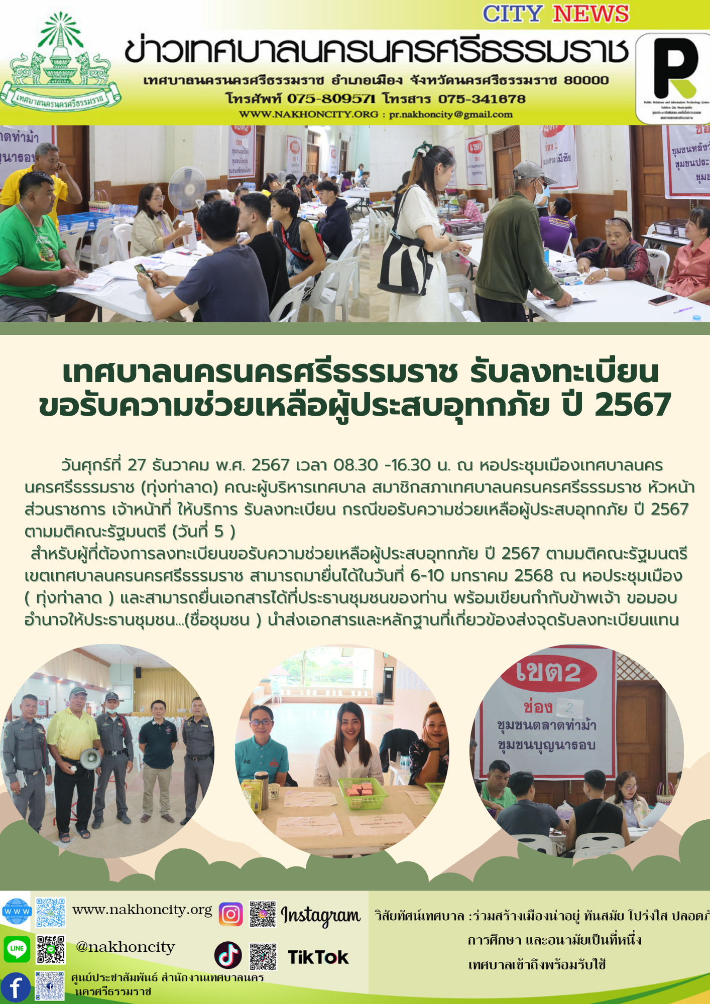 เทศบาลนครนครศรีธรรมราชให้บริการ รับลงทะเบียน กรณีขอรับความช่วยเหลือผู้ประสบอุทกภัย ปี 2567 ตามมติคณะรัฐมนตรี (วันที่ 4 ) |