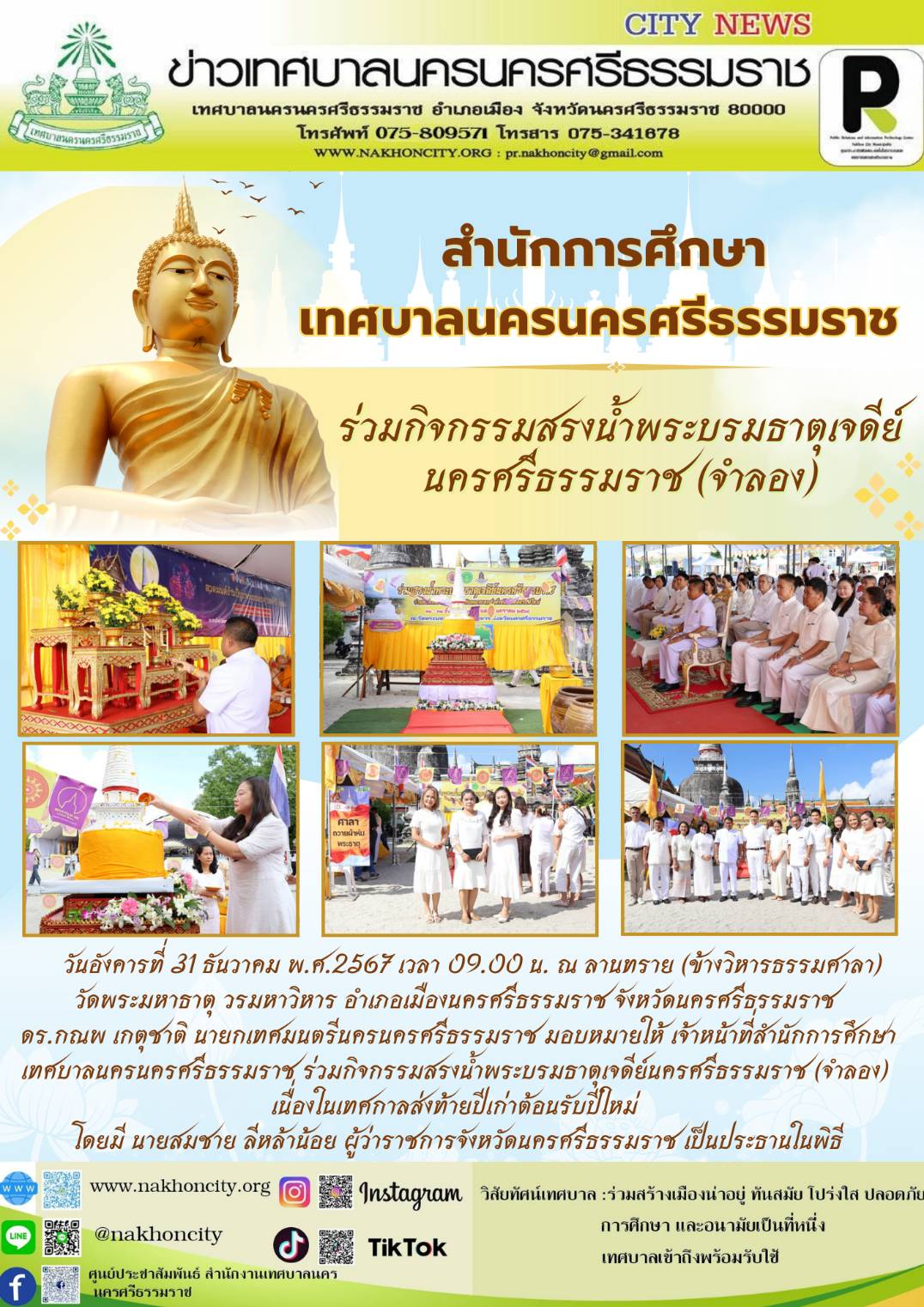 วันอังคารที่ 31 ธันวาคม พ.ศ.2567 เวลา 09.00 น. ณ ลานทราย (ข้างวิหารธรรมศาลา) วัดพระมหาธาตุ วรมหาวิหาร อำเภอเมืองนครศรีธรรมราช จังหวัดนครศรีธรรมราช ดร.กณพ เกตุชาติ นายกเทศมนตรีนครนครศรีธรรมราช มอบหมายให้ เจ้าหน้าที่สำนักการศึกษา เทศบาลนครนครศรีธรรมราช ร่วมกิจกรรมสรงน้ำพระบรมธาตุเจดีย์นครศรีธรรมราช (จำลอง) เนื่องในเทศกาลส่งท้ายปีเก่าต้อนรับปีใหม่ โดยมี นายสมชาย ลีหล้าน้อย ผู้ว่าราชการจังหวัดนครศรีธรรมราช เป็นประธานในพิธี ............... ภาพ//ข่าว//จันทร์จิรา |