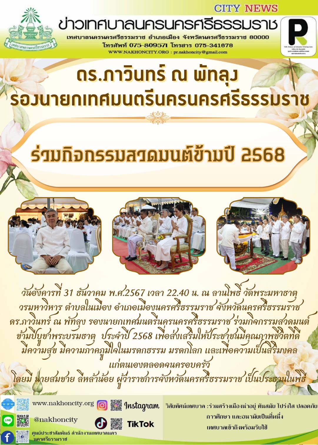 วันอังคารที่ 31 ธันวาคม พ.ศ.2567 เวลา 22.40.น. ณ ลานโพธิ์ วัดพระมหาธาตุ วรมหาวิหาร ตำบลในเมือง อำเภอเมืองนครศรีธรรมราช จังหวัดนครศรีธรรมราช ดร.ภาวินทร์ ณ พัทลุง รองนายกเทศมนตรีนครนครศรีธรรมราช ร่วมกิจกรรมสวดมนต์ข้ามปีบูชาพระบรมธาตุ ประจำปี 2568 เพื่อส่งเสริมให้ประชาชนมีคุณภาพชีวิตที่ดี มีความสุข มีความภาคภูมิใจในมรดกธรรม มรดกโลก และเพื่อความเป็นสิริมงคลแก่ตนเองตลอดจนครอบครัว |