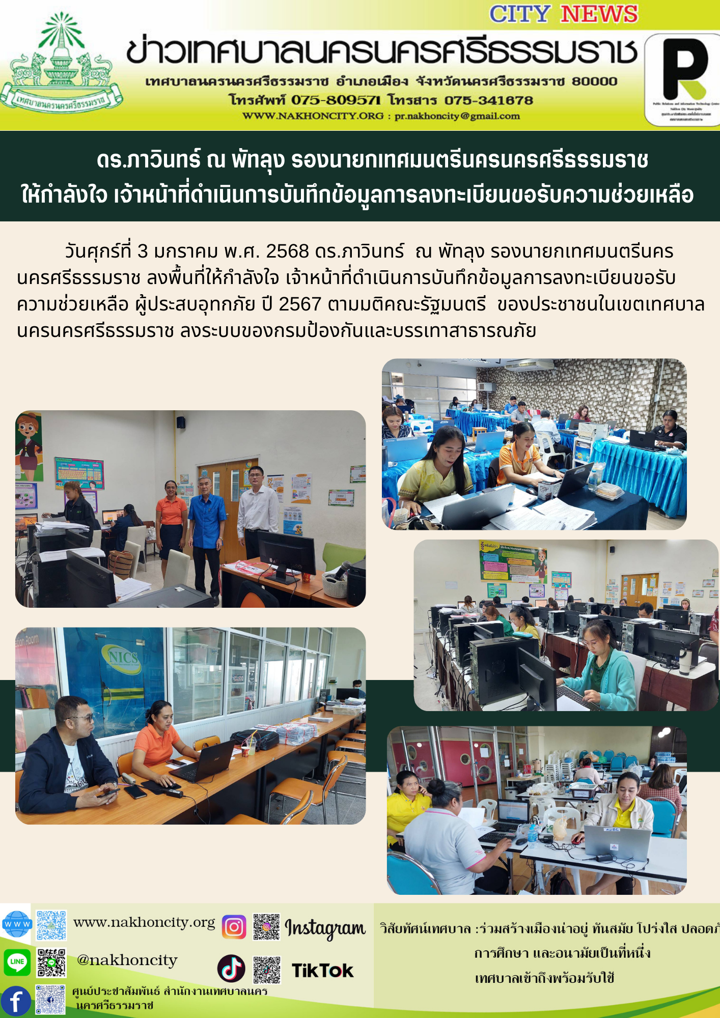 วันศุกร์ที่ 3 มกราคม พ.ศ. 2568 ดร.ภาวินทร์ ณ พัทลุง รองนายกเทศมนตรีนครนครศรีธรรมราช ลงพื้นที่ให้กำลังใจ เจ้าหน้าที่ดำเนินการบันทึกข้อมูลการลงทะเบียนขอรับความช่วยเหลือ ผู้ประสบอุทกภัย ปี 2567 ตามมติคณะรัฐมนตรี ของประชาชนในเขตเทศบาลนครนครศรีธรรมราช ลงระบบของกรมป้องกันและบรรเทาสาธารณภัย
