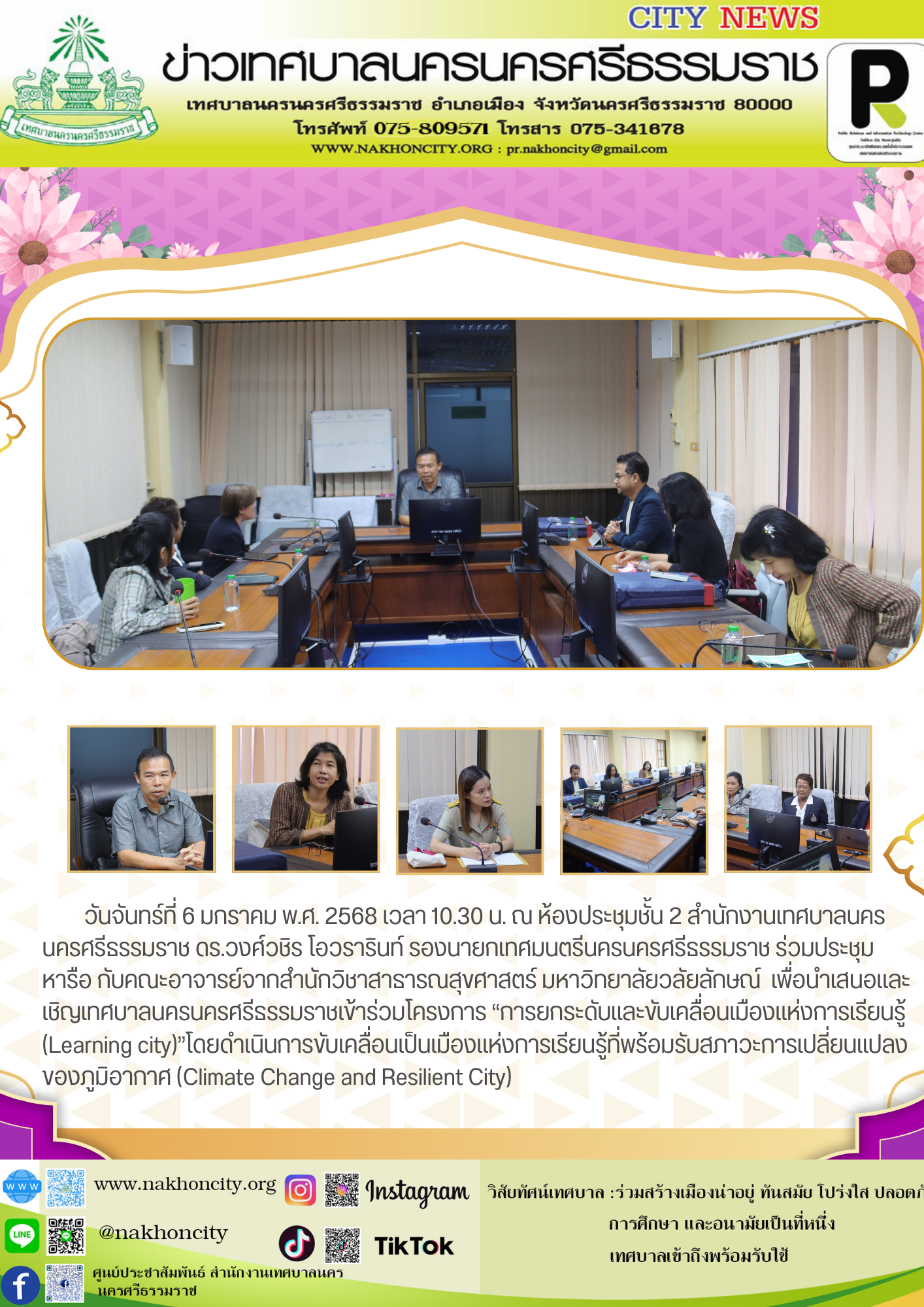 วันจันทร์ที่ 6 มกราคม พ.ศ. 2568 เวลา 10.30 น. ณ ห้องประชุมชั้น 2 สำนักงานเทศบาลนครนครศรีธรรมราช ดร.วงศ์วชิร โอวรารินท์ รองนายกเทศมนตรีนครนครศรีธรรมราช ร่วมประชุม หารือ กับคณะอาจารย์จากสำนักวิชาสาธารณสุขศาสตร์ มหาวิทยาลัยวลัยลักษณ์ เพื่อนำเสนอและเชิญเทศบาลนครนครศรีธรรมราชเข้าร่วมโครงการ “การยกระดับและขับเคลื่อนเมืองแห่งการเรียนรู้ (Learning city)” โดยดำเนินการขับเคลื่อนเป็นเมืองแห่งการเรียนรู้ที่พร้อมรับสภาวะการเปลี่ยนแปลงของภูมิอากาศ (Climate Change and Resilient City) |