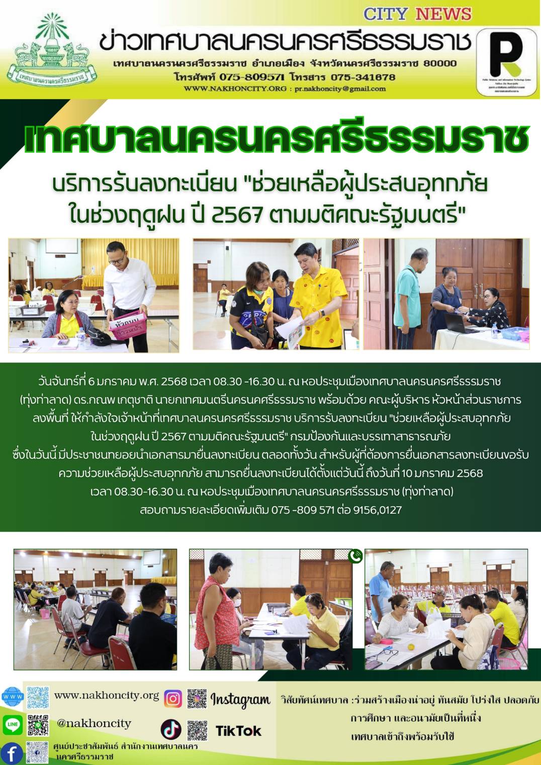 วันจันทร์ที่ 6 มกราคม พ.ศ. 2568 เวลา 08.30 -16.30 น. ณ หอประชุมเมืองเทศบาลนครนครศรีธรรมราช (ทุ่งท่าลาด) ดร.กณพ เกตุชาติ นายกเทศมนตรีนครนคศรีธรรมราช พร้อมด้วย คณะผู้บริหาร หัวหน้าส่วนราชการ ลงพื้นที่ ให้กำลังใจเจ้าหน้าที่เทศบาลนครนครศรีธรรมราช บริการรับลงทะเบียน "ช่วยเหลือผู้ประสบอุทกภัยในช่วงฤดูฝน ปี 2567 ตามมติคณะรัฐมนตรี" กรมป้องกันและบรรเทาสาธารณภัย |