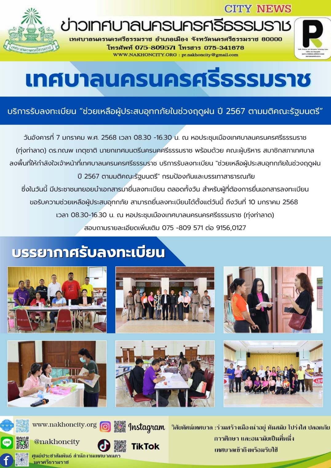 วันอังคารที่ 7 มกราคม พ.ศ. 2568 เวลา 08.30 -16.30 น. ณ หอประชุมเมืองเทศบาลนครนครศรีธรรมราช (ทุ่งท่าลาด) ดร.กณพ เกตุชาติ นายกเทศมนตรีนครนคศรีธรรมราช พร้อมด้วย คณะผู้บริหาร สมาชิกสภาเทศบาล ลงพื้นที่ให้กำลังใจเจ้าหน้าที่เทศบาลนครนครศรีธรรมราช บริการรับลงทะเบียน "ช่วยเหลือผู้ประสบอุทกภัยในช่วงฤดูฝน ปี 2567 ตามมติคณะรัฐมนตรี" กรมป้องกันและบรรเทาสาธารณภัย |