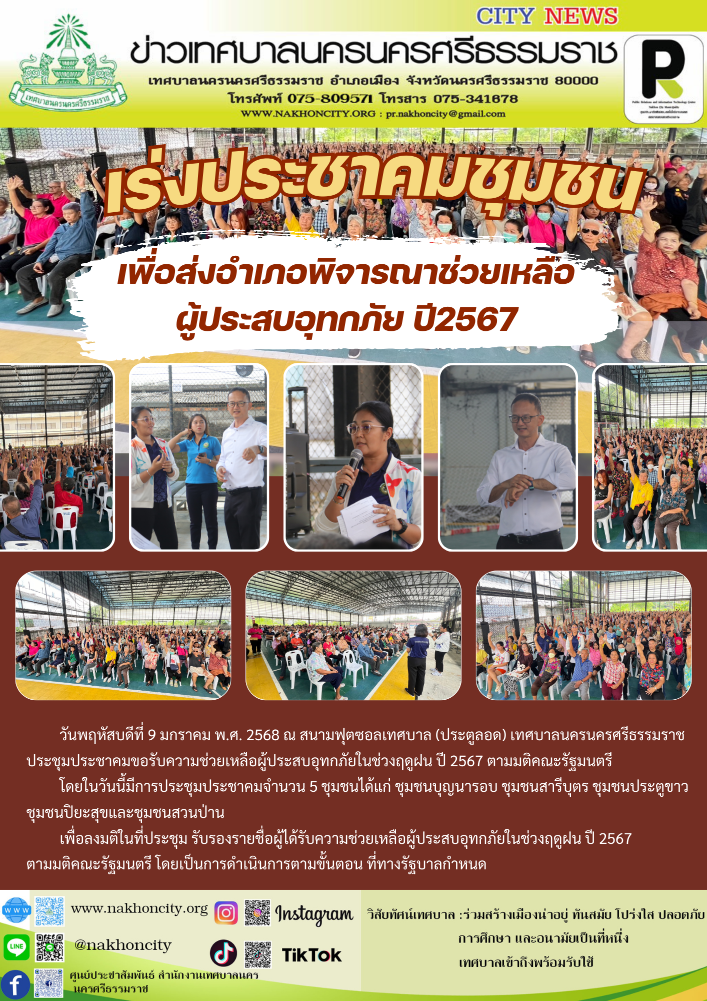วันพฤหัสบดีที่ 9 มกราคม พ.ศ. 2568 ณ สนามฟุตซอลเทศบาล (ประตูลอด) เทศบาลนครนครศรีธรรมราช ประชุมประชาคมขอรับความช่วยเหลือผู้ประสบอุทกภัยในช่วงฤดูฝน ปี 2567 ตามมติคณะรัฐมนตรี โดยในวันนี้มีการประชุมประชาคมจำนวน 5 ชุมชนได้แก่ ชุมชนบุญนารอบ ชุมชนสารีบุตร ชุมชนประตูขาว ชุมชนปิยะสุข และชุมชนสวนป่าน เพื่อลงมติในที่ประชุม รับรองรายชื่อผู้ได้รับความช่วยเหลือผู้ประสบอุทกภัยในช่วงฤดูฝน ปี 2567 ตามมติคณะรัฐมนตรี โดยเป็นการดำเนินการตามขั้นตอน ที่ทางรัฐบาลกำหนด |