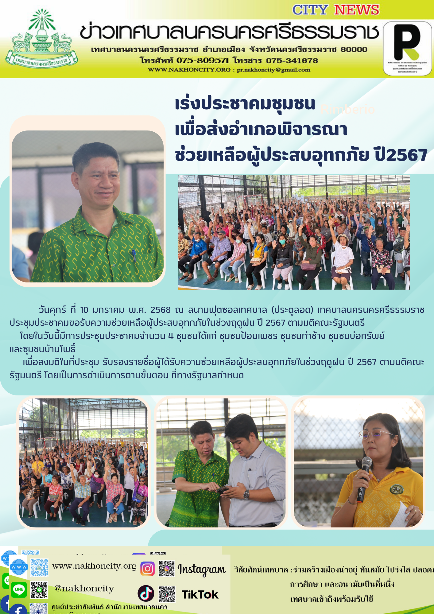 เทศบาลนครนครศรีธรรมราช เร่งประชาคมชุมชน เพื่อส่งอำเภอพิจารณา ช่วยเหลือผู้ประสบอุทกภัย ปี2567 |