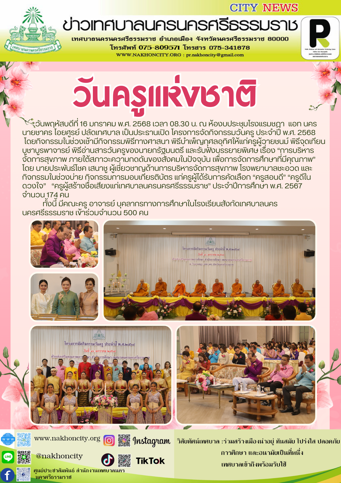 วันพฤหัสบดีที่ 16 มกราคม พ.ศ. 2568 เวลา 08.30 น. ณ ห้องบประชุมโรงแรมชฎา แอท นคร นายชาคร ไอยศูรย์ ปลัดเทศบาล เป็นประธานเปิด โครงการจัดกิจกรรมวันครู ประจำปี พ.ศ. 2568 โดยกิจกรรมในช่วงเช้ามีกิจกรรมพิธีทางศาสนา พิธีบำเพ็ญกุศลอุทิศให้แก่ครูผู้วายชนม์ พิธีจุดเทียนบูชาบูรพาจารย์ พิธีอ่านสารวันครูของนายกรัฐมนตรี และรับฟังบรรยายพิเศษ เรื่อง “การบริหารจัดการสุขภาพ ภายใต้สภาวะความกดดันของสังคมในปัจจุบัน เพื่อการจัดการศึกษาที่มีคุณภาพ” โดย นายประพันธ์โชค เสนาชู ผู้เชี่ยวชาญด้านการบริหารจัดการสุขภาพ โรงพยาบาลชะอวด และกิจกรรมในช่วงบ่าย กิจกรรมการมอบเกียรติบัตร แก่ครูผู้ได้รับการคัดเลือก “ครูสอนดี” “ครูดีในดวงใจ” “ครูผู้สร้างชื่อเสียงแก่เทศบาลนครนครศรีธรรมราช” ประจำปีการศึกษา พ.ศ. 2567 จำนวน 174 คน |