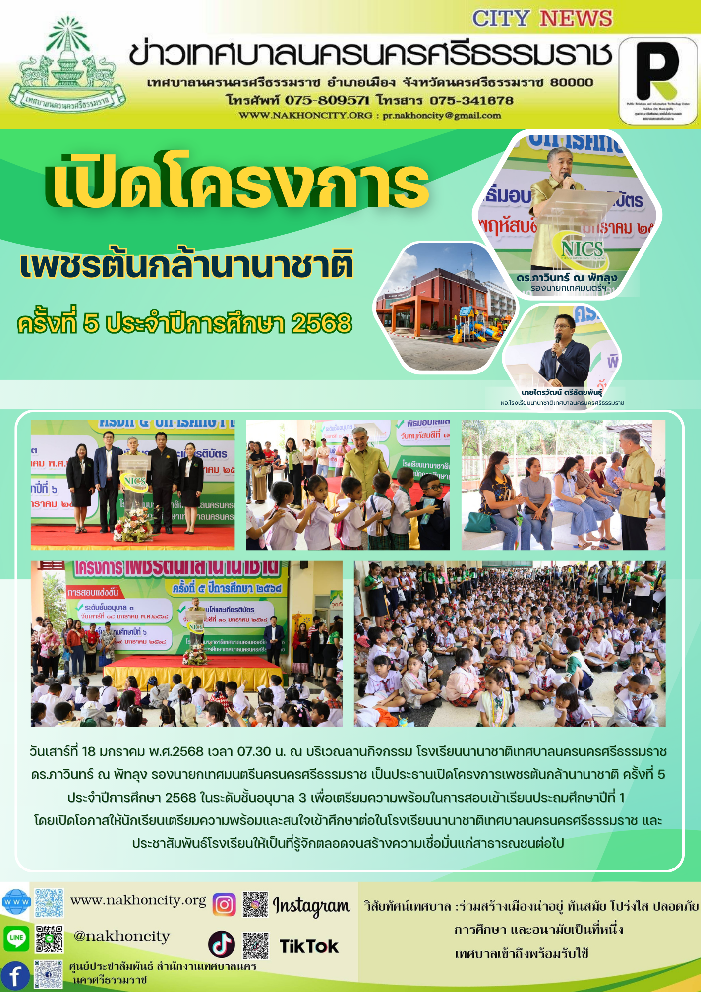 ดร.ภาวินทร์ ณ พัทลุง รองนายกเทศมนตรีนครนครศรีธรรมราช เป็นประธานเปิดโครงการเพชรต้นกล้านานาชาติ ครั้งที่ 5 ประจำปีการศึกษา 2568 |