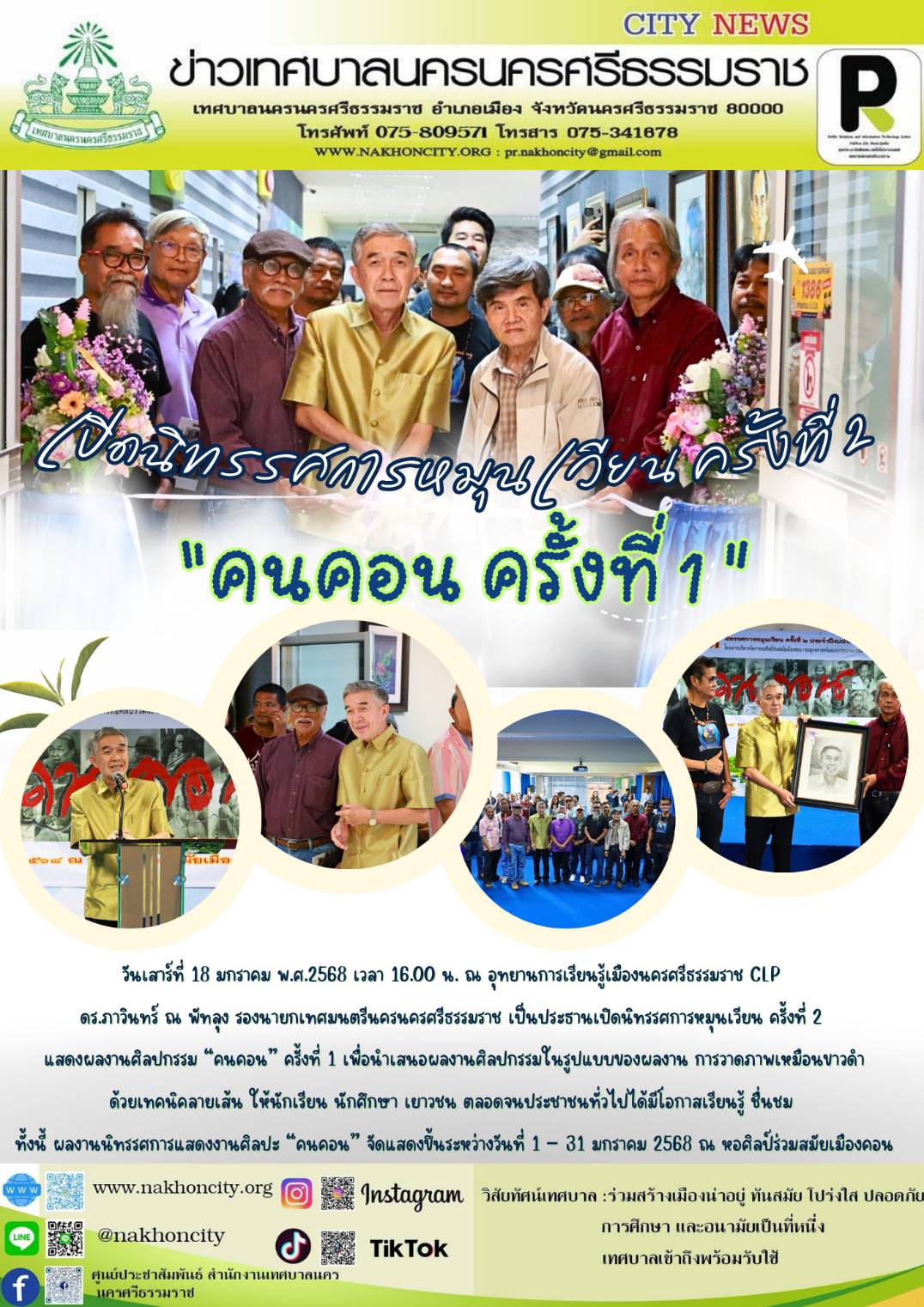 วันเสาร์ที่ 18 มกราคม พ.ศ.2568 เวลา 16.00 น. ณ อุทยานการเรียนรู้เมืองนครศรีธรรมราช CLP ดร.ภาวินทร์ ณ พัทลุง รองนายกเทศมนตรีนครนครศรีธรรมราช เป็นประธานเปิดนิทรรศการหมุนเวียน ครั้งที่ 2 แสดงผลงานศิลปกรรม “คนคอน” ครั้งที่ 1 เพื่อนำเสนอผลงานศิลปกรรมในรูปแบบของผลงาน การวาดภาพเหมือนขาวดำด้วยเทคนิคลายเส้น ให้นักเรียน นักศึกษา เยาวชน ตลอดจนประชาชนทั่วไปได้มีโอกาสเรียนรู้ ชื่นชม |