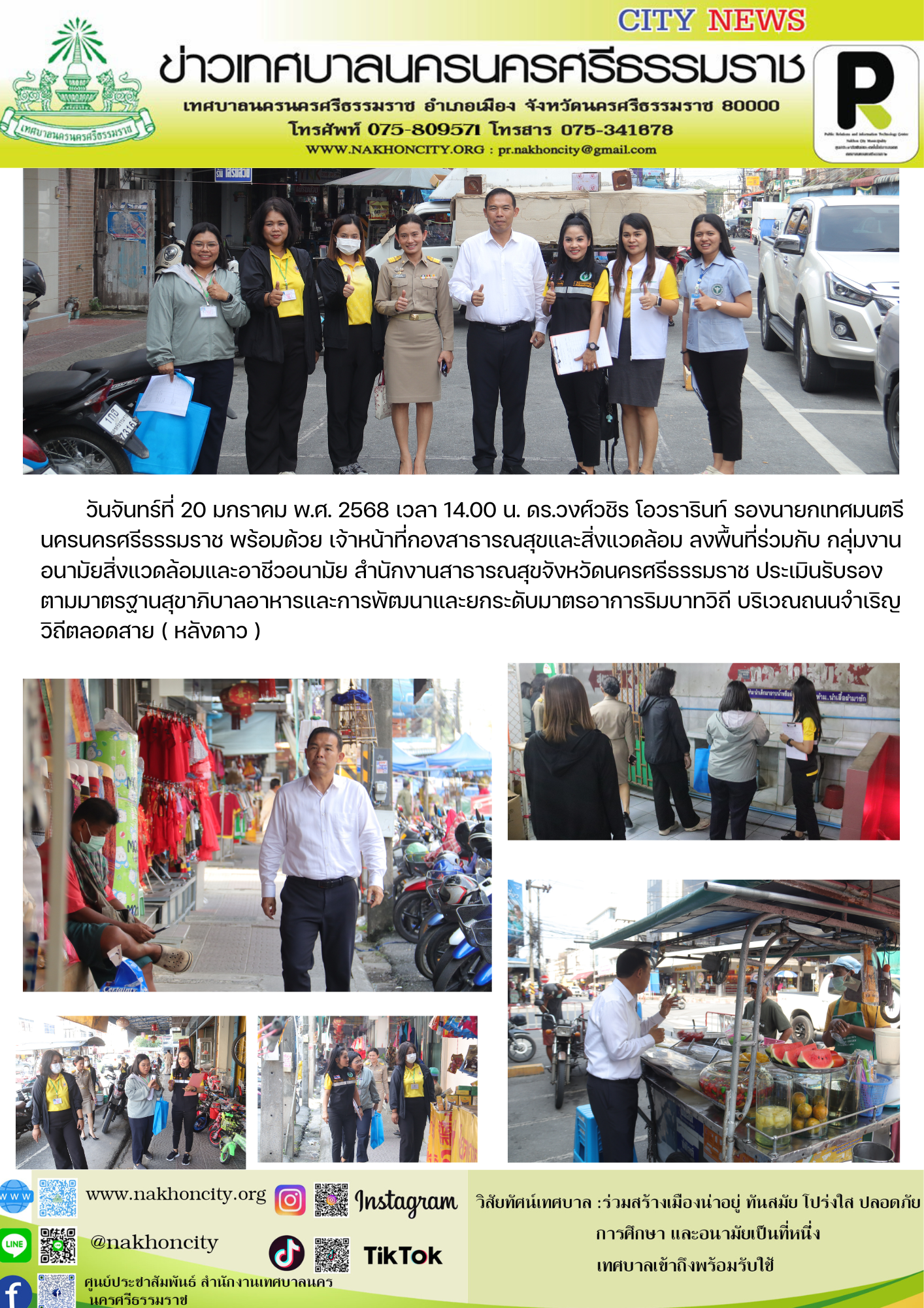 วันจันทร์ที่ 20 มกราคม พ.ศ. 2568 เวลา 14.00 น. ดร.วงศ์วชิร โอวรารินท์ รองนายกเทศมนตรีนครนครศรีธรรมราช พร้อมด้วย เจ้าหน้าที่กองสาธารณสุขและสิ่งแวดล้อม ลงพื้นที่ร่วมกับ กลุ่มงานอนามัยสิ่งแวดล้อมและอาชีวอนามัย สำนักงานสาธารณสุขจังหวัดนครศรีธรรมราช ประเมินรับรองตามมาตรฐานสุขาภิบาลอาหารและการพัฒนาและยกระดับมาตรอาการริมบาทวิถี บริเวณถนนจำเริญวิถีตลอดสาย ( หลังดาว ) |