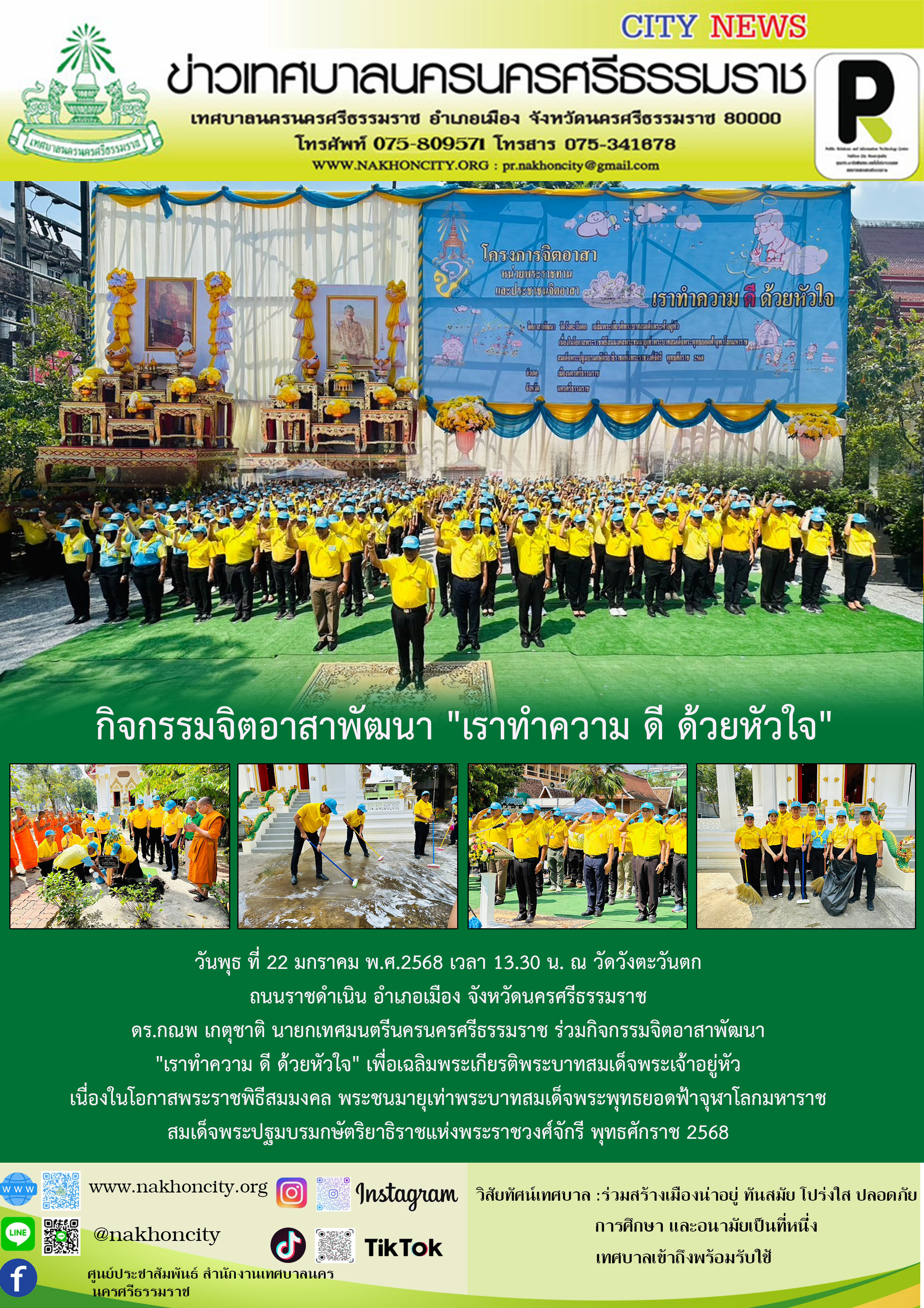 นายกเทศมนตรีนครนครศรีธรรมราช ร่วมกิจกรรมจิตอาสาพัฒนา "เราทำความ ดี ด้วยหัวใจ" เพื่อเฉลิมพระเกียรติพระบาทสมเด็จพระเจ้าอยู่หัว เนื่องในโอกาสพระราชพิธีสมมงคลพระชนมายุเท่าพระบาทสมเด็จพระพุทธยอดฟ้าจุฬาโลกมหาราช สมเด็จพระปฐมบรมกษัตริยาธิราชแห่งพระราชวงศ์จักรี พุทธศักราช 2568 |