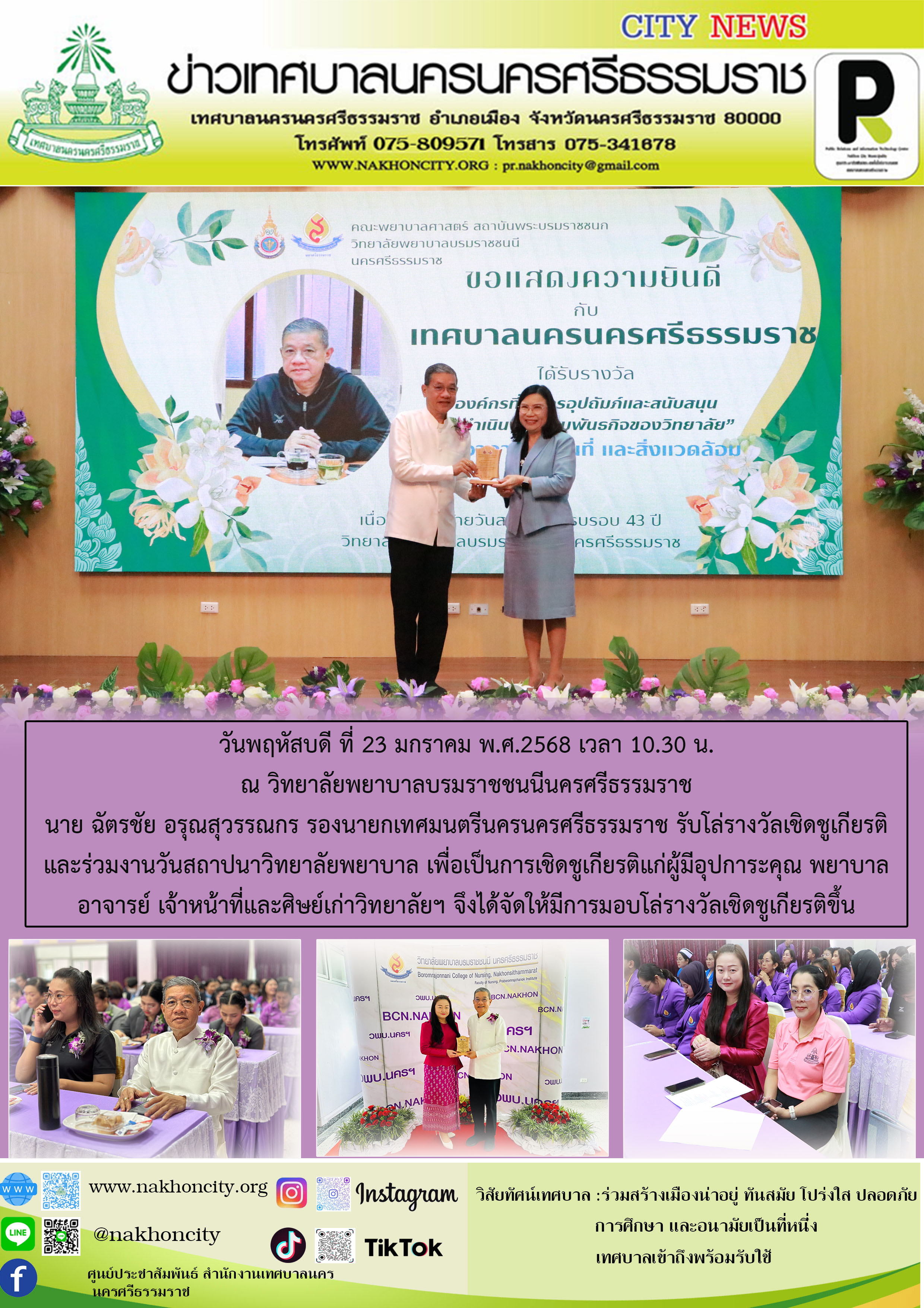 รองนายกเทศมนตรีนครนครศรีธรรมราช รับโล่รางวัลเชิดชูเกียรติ และร่วมงานวันสถาปนาวิทยาลัยพยาบาล |