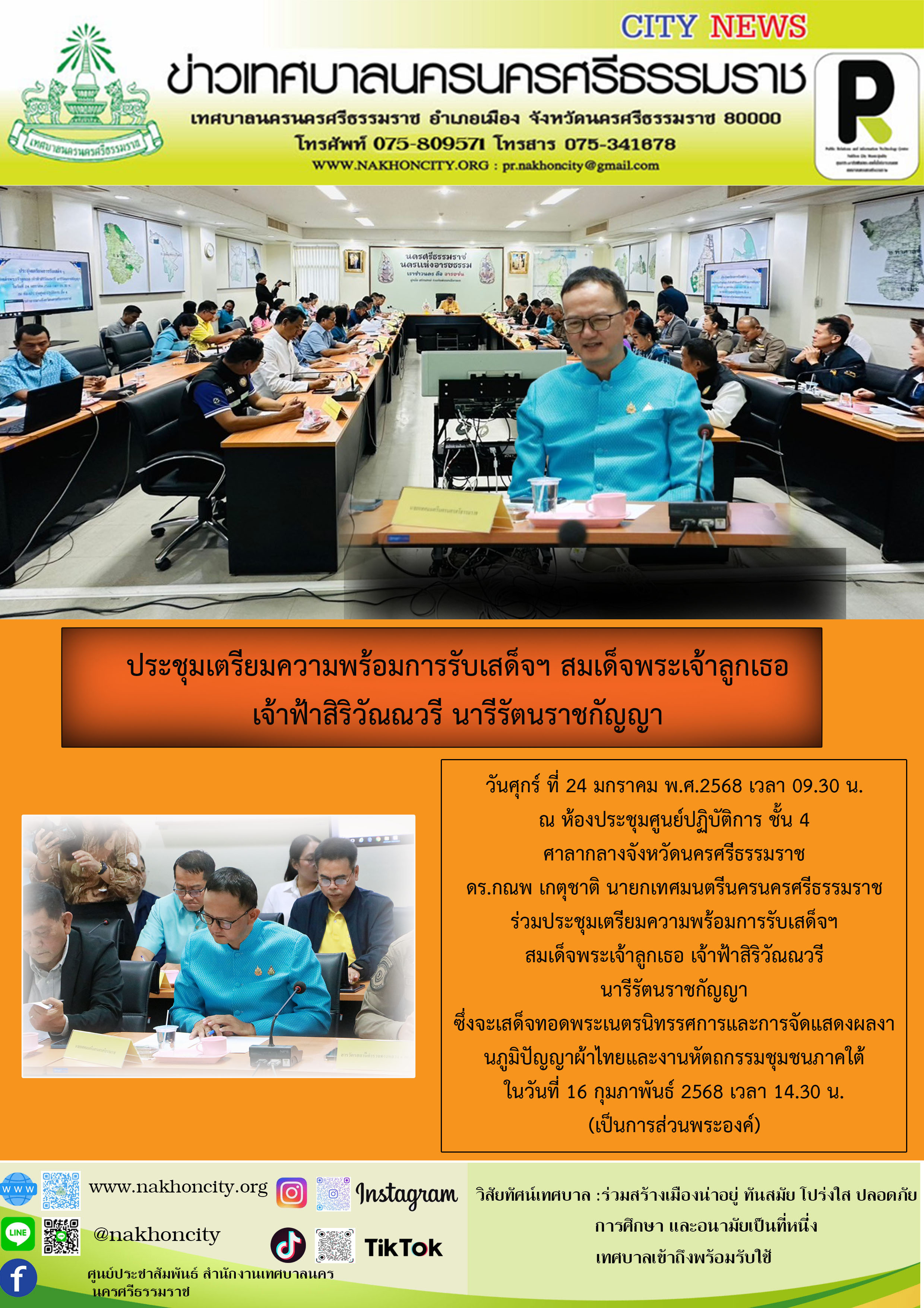 นายกเทศมนตรีนครนครศรีธรรมราช ร่วมประชุมเตรียมความพร้อมการรับเสด็จฯ สมเด็จพระเจ้าลูกเธอ เจ้าฟ้าสิริวัณณวรี นารีรัตนราชกัญญา ซึ่งจะเสด็จทอดพระเนตรนิทรรศการและการจัดแสดงผลงานภูมิปัญญาผ้าไทยและงานหัตถกรรมชุมชนภาคใต้ |