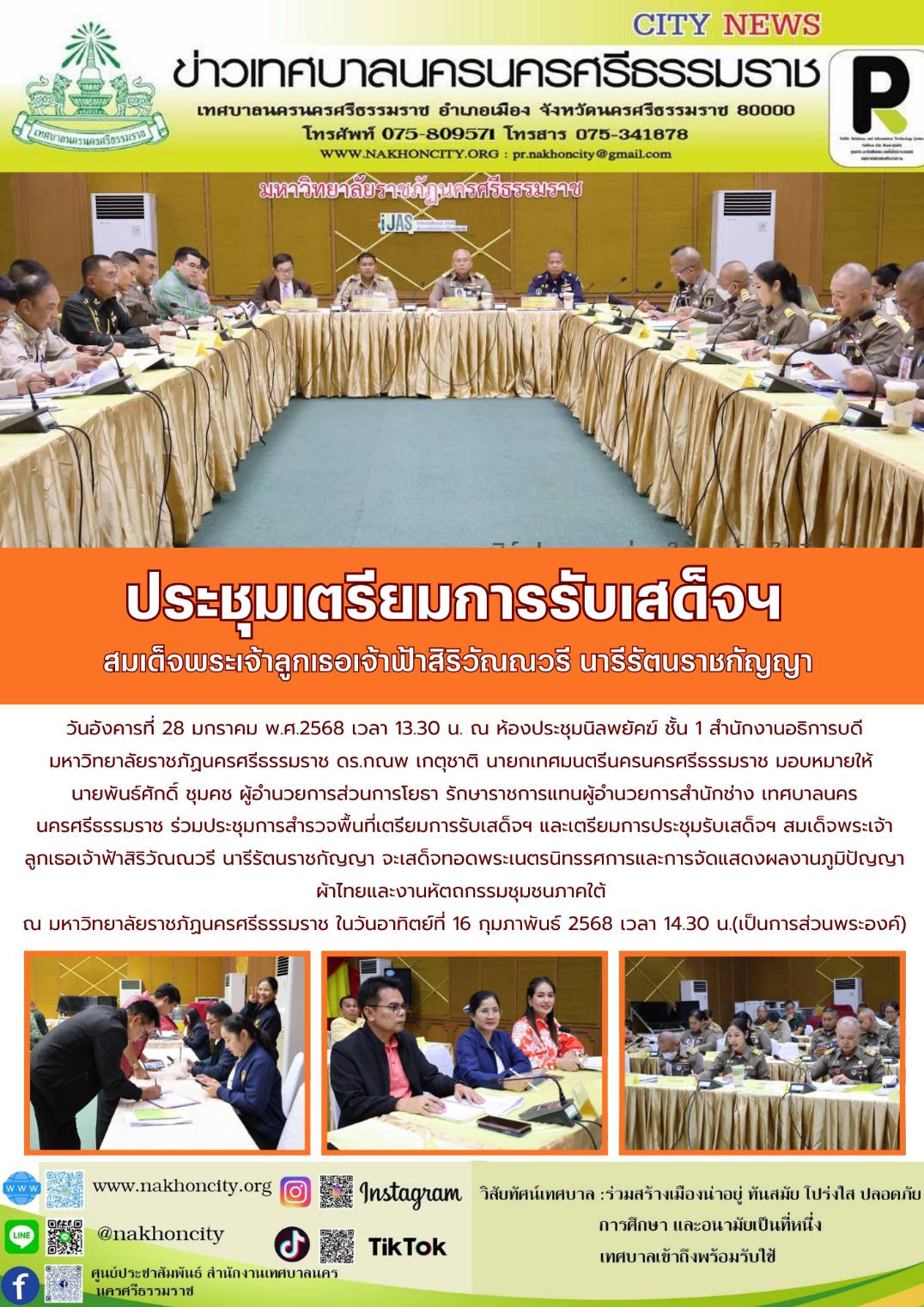 วันอังคารที่ 28 มกราคม พ.ศ.2568 เวลา 13.30 น. ณ ห้องประชุมนิลพยัคฆ์ ชั้น 1 สำนักงานอธิการบดี มหาวิทยาลัยราชภัฏนครศรีธรรมราช ดร.กณพ เกตุชาติ นายกเทศมนตรีนครนครศรีธรรมราช มอบหมายให้ นายพันธ์ศักดิ์ ชุมคช ผู้อำนวยการส่วนการโยธา รักษาราชการแทนผู้อำนวยการสำนักช่าง เทศบาลนครนครศรีธรรมราช ร่วมประชุมการสำรวจพื้นที่เตรียมการรับเสด็จฯ และเตรียมการประชุมรับเสด็จฯ สมเด็จพระเจ้าลูกเธอเจ้าฟ้าสิริวัณณวรี นารีรัตนราชกัญญา จะเสด็จทอดพระเนตรนิทรรศการและการจัดแสดงผลงานภูมิปัญญาผ้าไทยและงานหัตถกรรมชุมชนภาคใต้ ณ มหาวิทยาลัยราชภัฏนครศรีธรรมราช ในวันอาทิตย์ที่ 16 กุมภาพันธ์ 2568 เวลา 14.30 น.(เป็นการส่วนพระองค์) ............... ข่าว//จันทร์จิรา ภาพ//จันทร์จิรา//เจนจิรา//ปัญชนา (นักศึกษาฝึกงาน) |