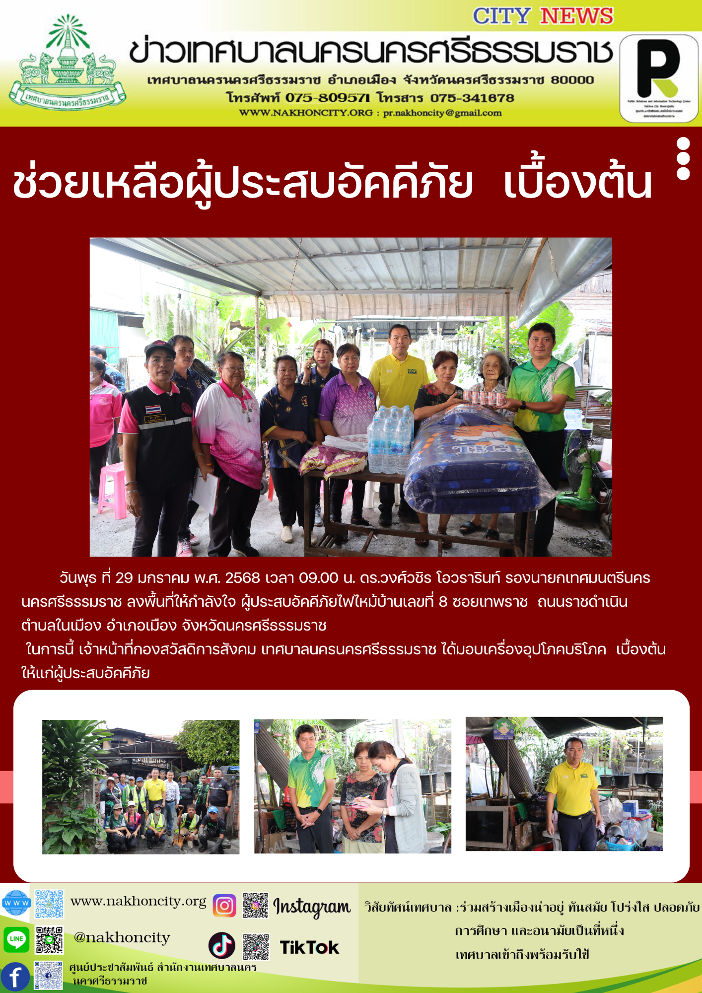 วันพุธ ที่ 29 มกราคม พ.ศ. 2568 เวลา 09.00 น. ดร.วงศ์วชิร โอวรารินท์ รองนายกเทศมนตรีนครนครศรีธรรมราช ลงพื้นที่ให้กำลังใจ ผู้ประสบอัคคีภัยไฟไหม้บ้านเลขที่ 8 ซอยเทพราช ถนนราชดำเนิน ตำบลในเมือง อำเภอเมือง จังหวัดนครศรีธรรมราช ในการนี้ เจ้าหน้าที่กองสวัสดิการสังคม เทศบาลนครนครศรีธรรมราช ได้มอบเครื่องอุปโภค บริโภค เบื้องต้น ให้แก่ผู้ประสบอัคคีภัย |