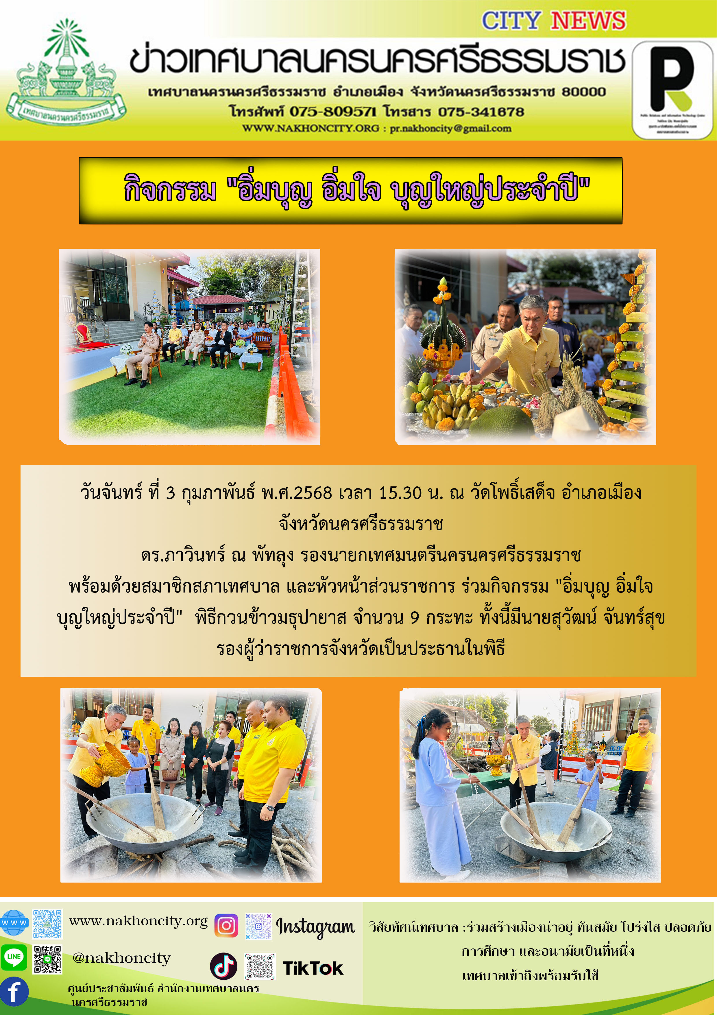 รองนายกเทศมนตรีนครนครศรีธรรมราช พร้อมด้วยสมาชิกสภาเทศบาล และหัวหน้าส่วนราชการ ร่วมกิจกรรม "อิ่มบุญ อิ่มใจ บุญใหญ่ประจำปี" พิธีกวนข้าวมธุปายาส จำนวน 9 กระทะ |