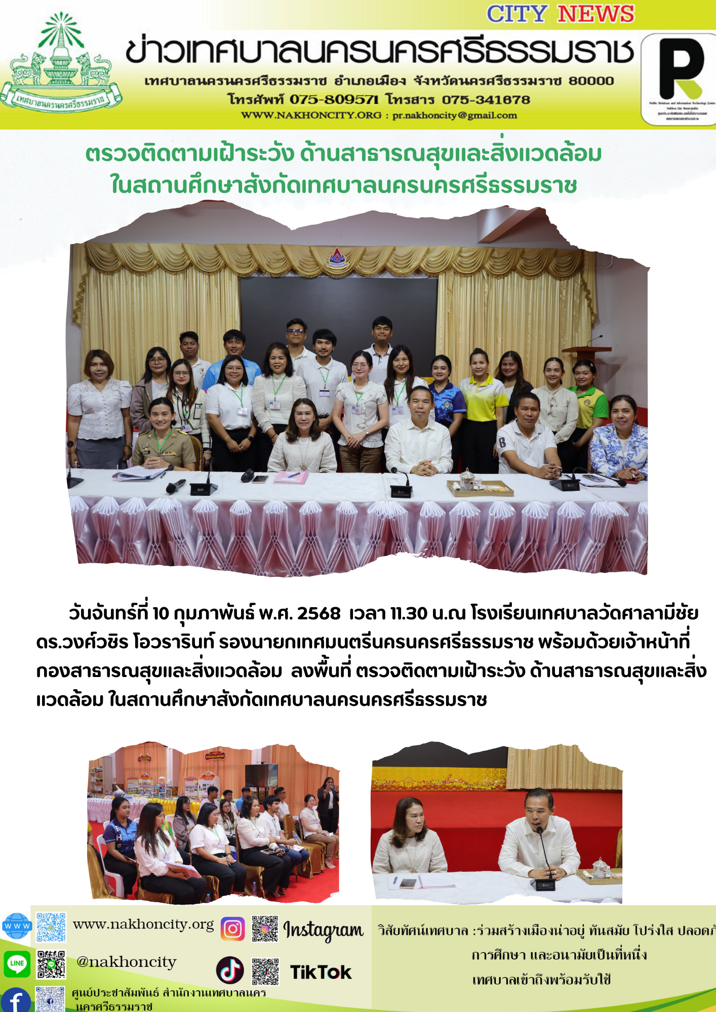 วันจันทร์ที่ 10 กุมภาพันธ์ พ.ศ. 2568 ณ โรงเรียนเทศบาลวัดศาลามีชัย เวลา 11.30 น. ดร.วงศ์วชิร โอวรารินท์ รองนายกเทศมนตรีนครนครศรีธรรมราช พร้อมด้วยเจ้าหน้าที่กองสาธารณสุขและสิ่งแวดล้อม ลงพื้นที่ ตรวจติดตามเฝ้าระวัง ด้านสาธารณสุขและสิ่งแวดล้อม ในสถานศึกษาสังกัดเทศบาลนครนครศรีธรรมราช |