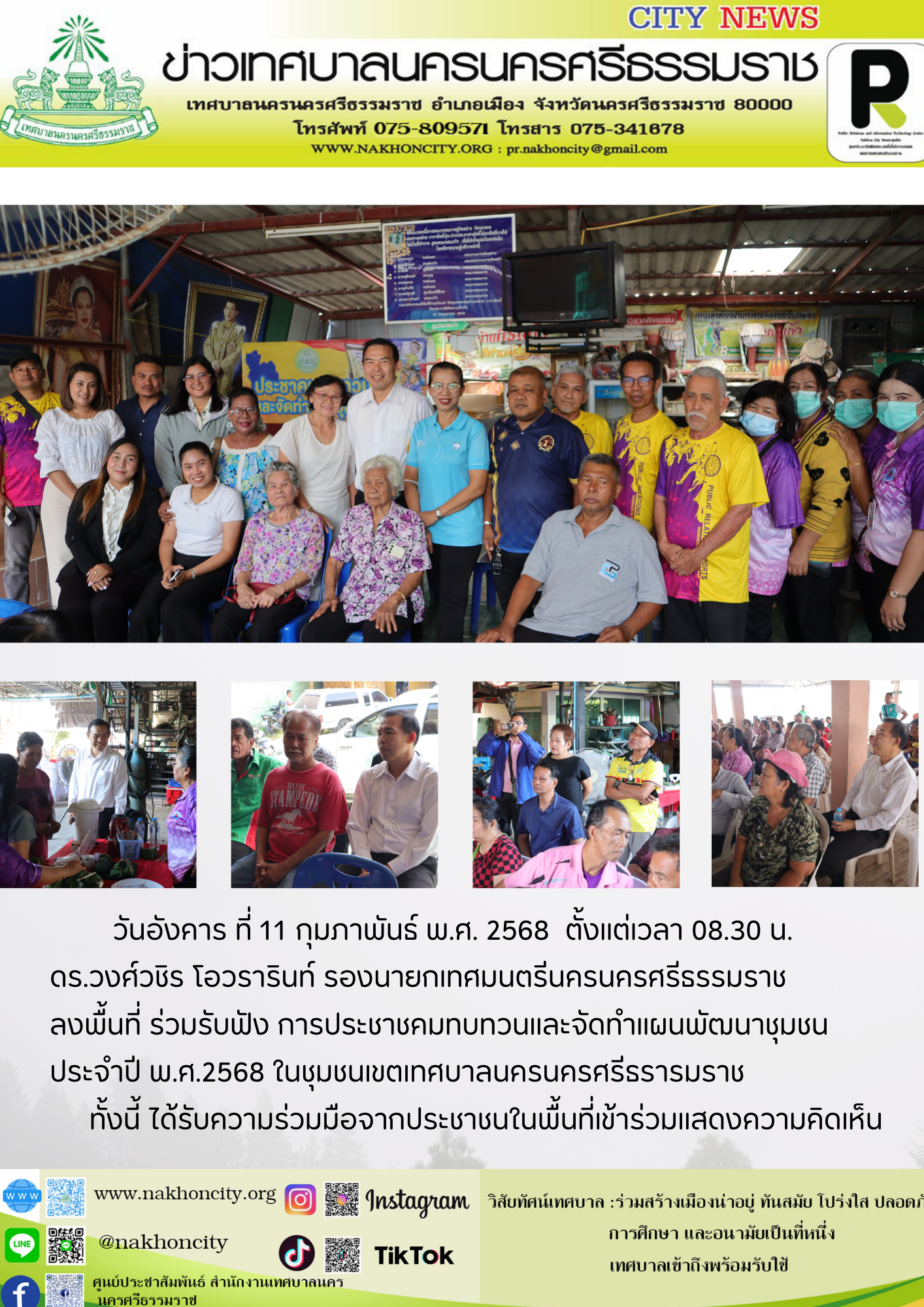 ดร.วงศ์วชิร โอวรารินท์ รองนายกเทศมนตรีนครนครศรีธรรมราช ลงพื้นที่ ร่วมรับฟัง การประชาชคมทบทวนและจัดทำแผนพัฒนาชุมชน ประจำปี พ.ศ.2568 ชุมชนในเขตเทศบาลนครนครศรีธรารมราช |